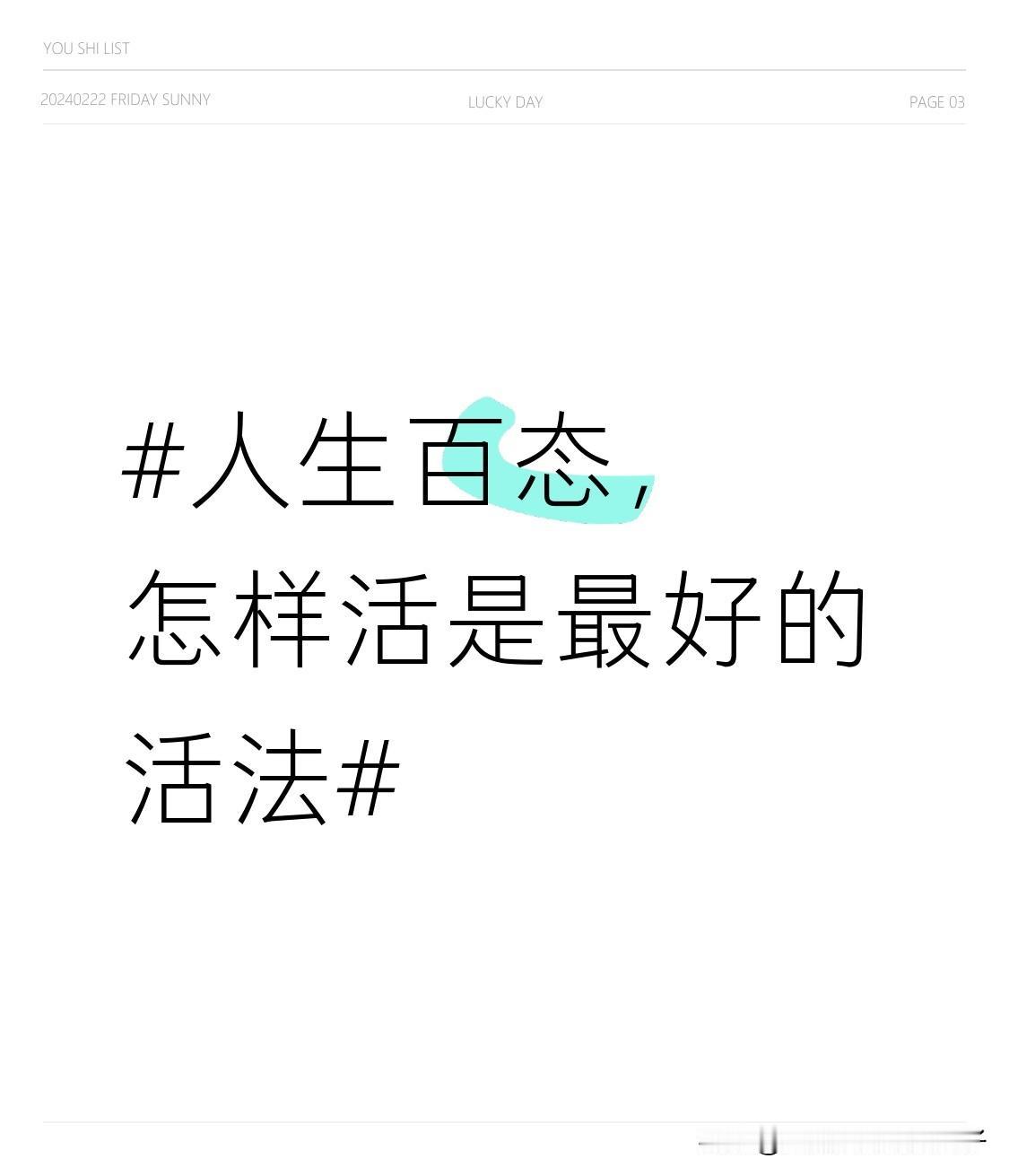 人生百态,最好的活法没有固定答案。我觉得,首先得跟自己和解。大多数人都是普通人,接纳平凡,别老跟自己较劲内耗,别为凑别人的“满分答卷”焦虑。真诚做自己,不用为迎合他人戴上面具。与人相处有分寸感,亲疏有度。 生活总有顺逆,骨子里得坚强,有面对困境的勇气。同时,朋友在质不在量,有一两个真心知己就够。别老盯着别人的生活,过好自己的日子。过去就过去,烂事别较真。说到底,身安、心静,日子稳当,就是顶级活法。
