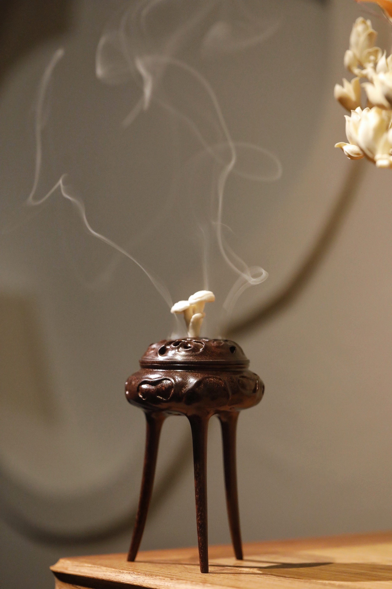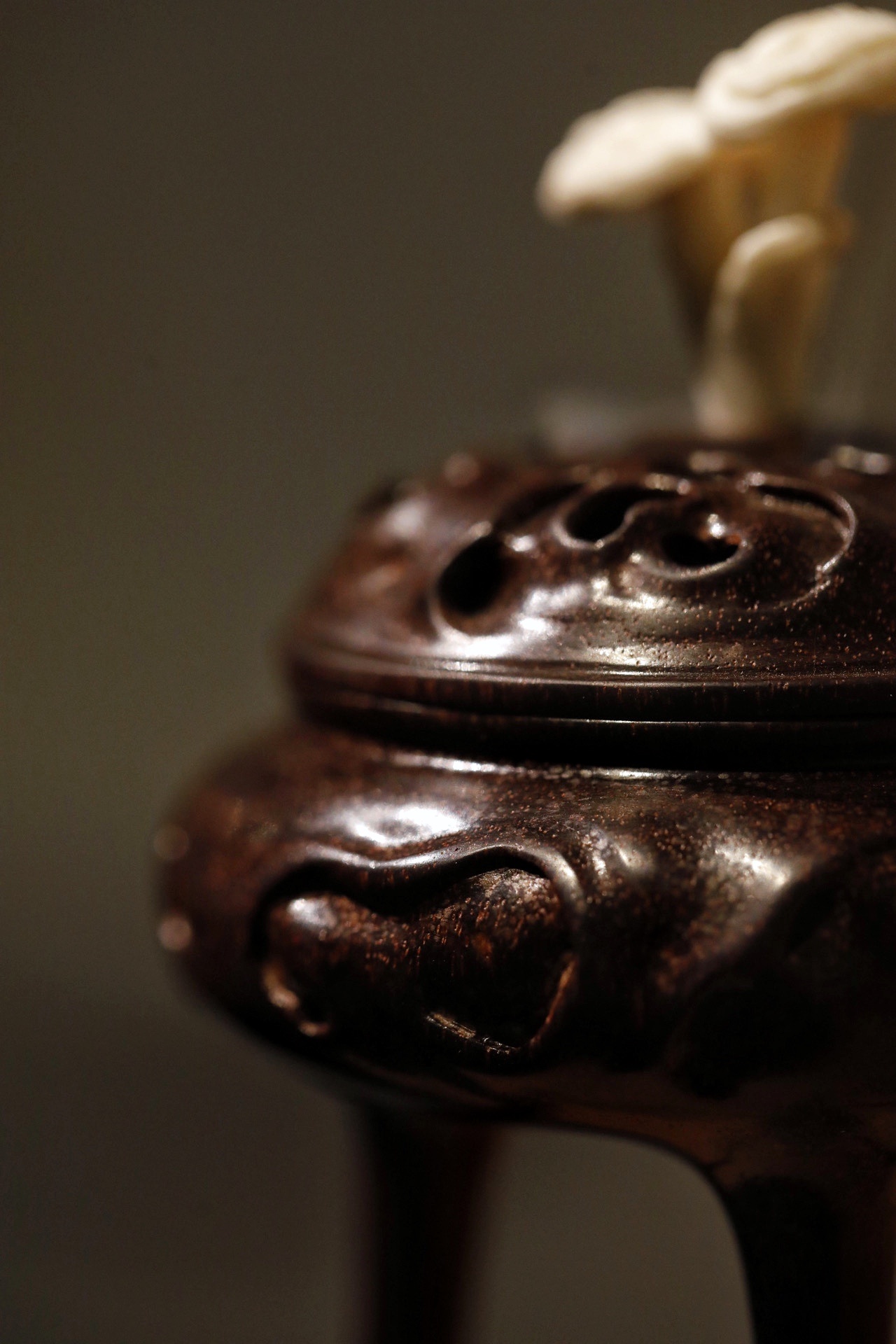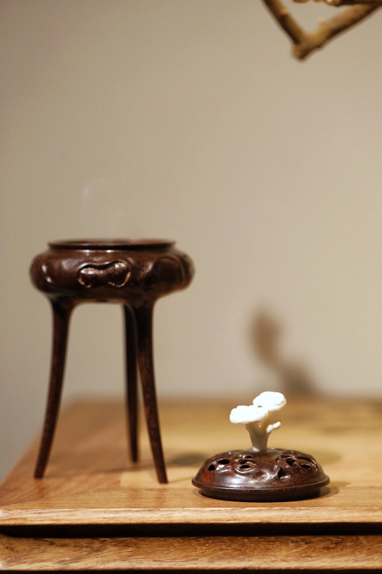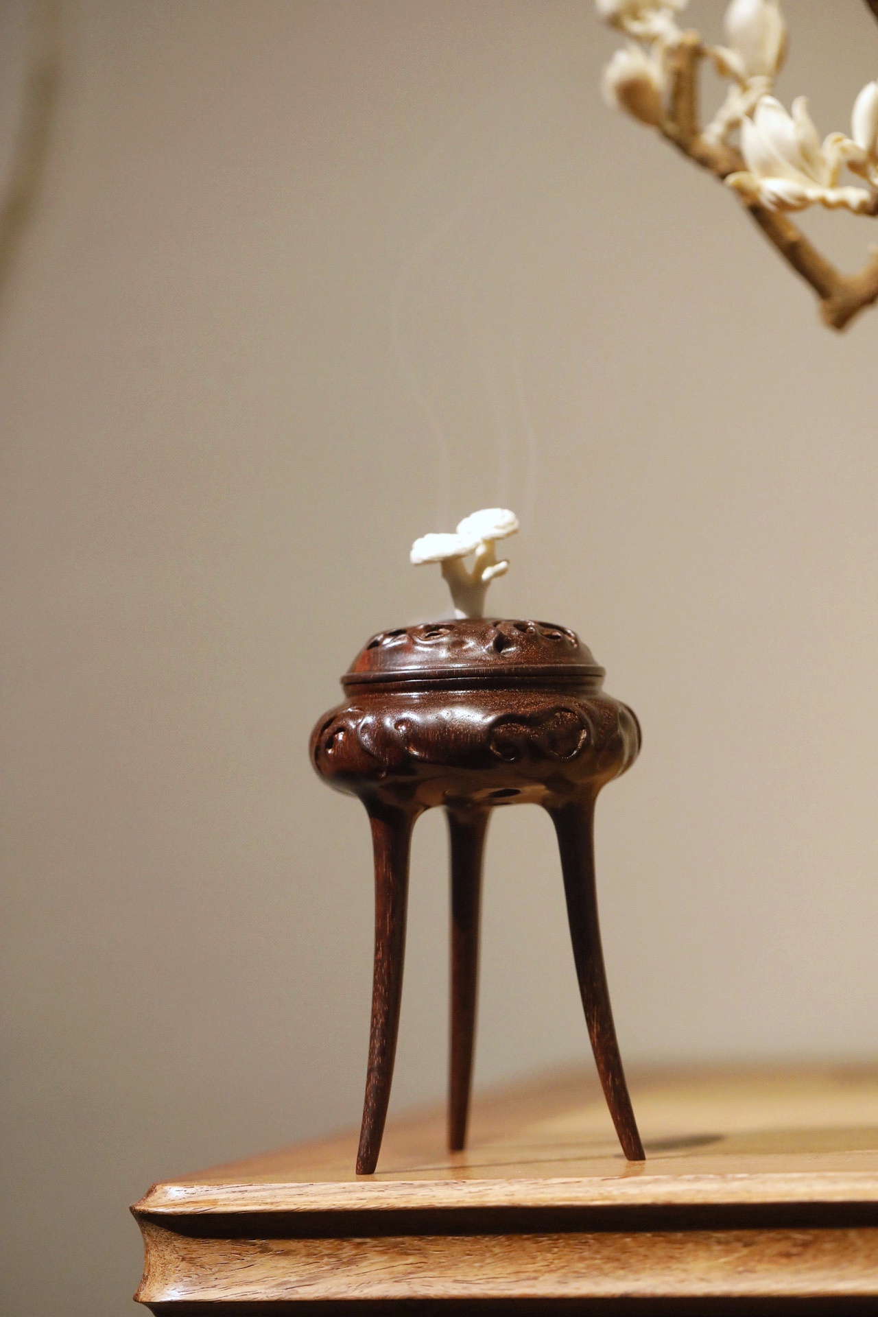 小叶紫檀×鹿角|灵芝香炉整料雕刻,炉身雕纹婉转,三足修长挺拔,鹿角灵芝缀于炉顶,青烟袅袅,古雅清逸,禅意悠然。直径7.5×15cm重量90g