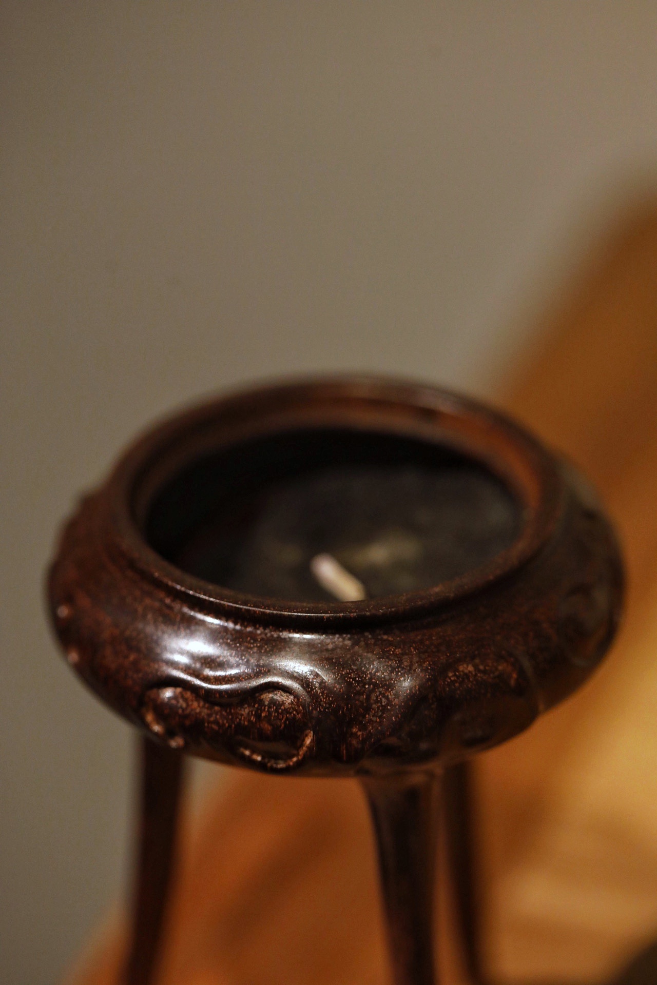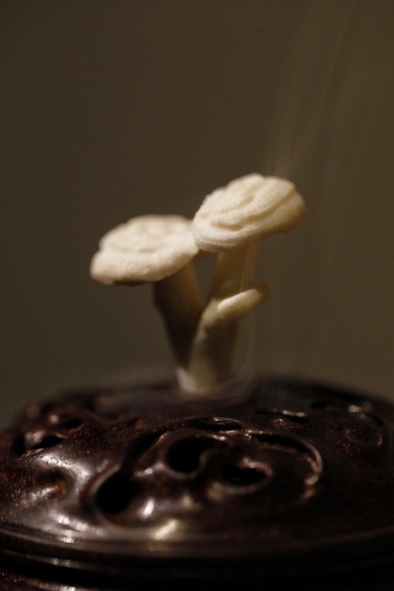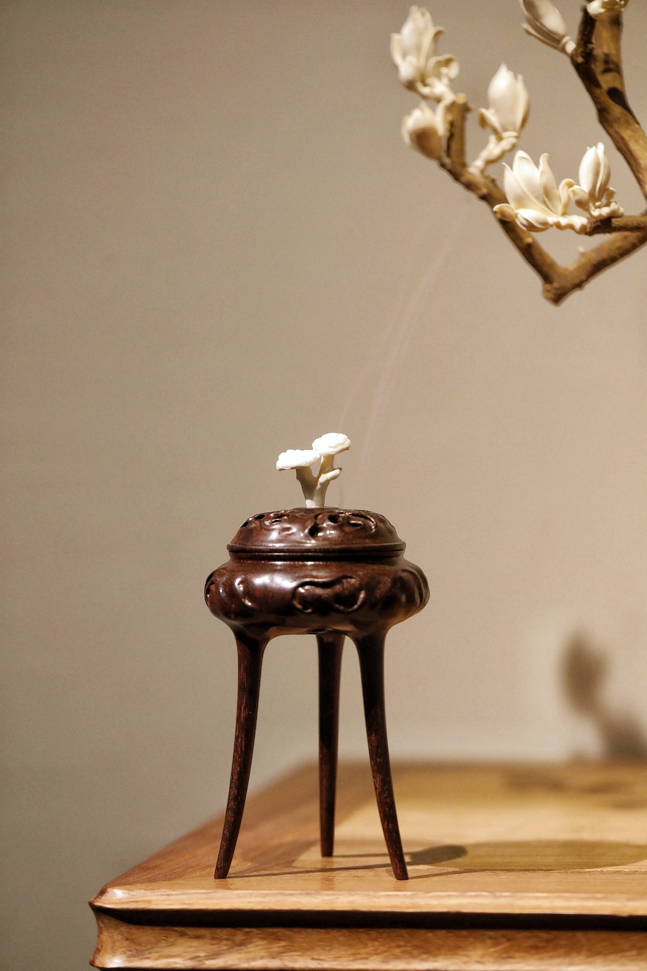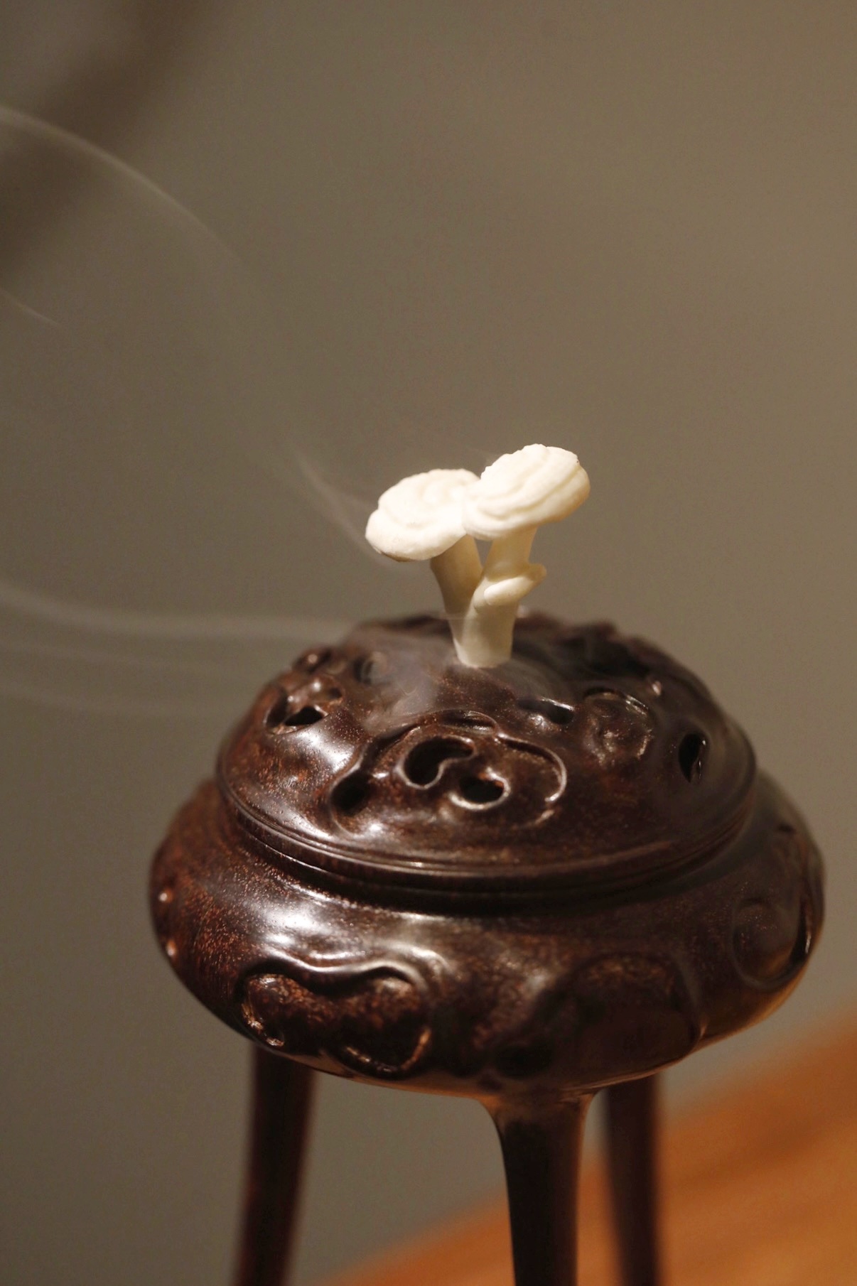 小叶紫檀×鹿角|灵芝香炉整料雕刻,炉身雕纹婉转,三足修长挺拔,鹿角灵芝缀于炉顶,青烟袅袅,古雅清逸,禅意悠然。直径7.5×15cm重量90g