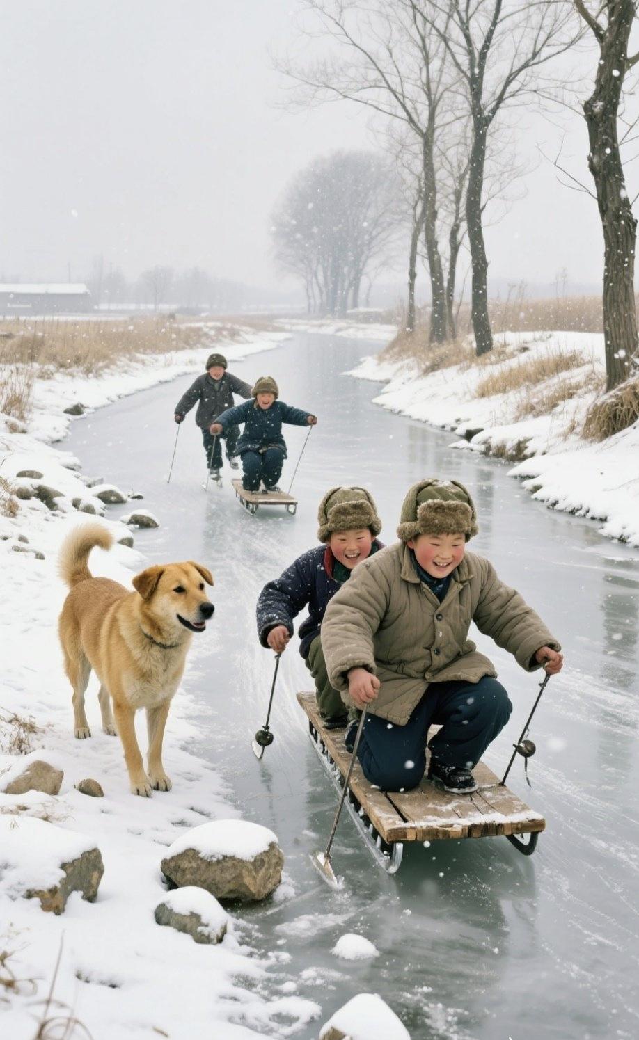 《冰溪童趣》 雪落冰溪玉作廊, 木橇飞滑少年狂。 黄犬蹲坡摇尾看, 笑声撞碎雪茫茫。 寒枝疏影凝霜白, 冰钎划水破银皑。 野趣不输春烂漫, 一身烟火满身乖。 赏析:这首诗以画面里冰溪、木橇、少年、黄犬为核心意象,用“飞滑”“撞碎”“划水破”等动态动词,勾勒出冬日里孩童玩冰橇的鲜活场景。前半段捕捉少年的嬉闹与黄犬的憨态,将雪地的静与孩童的动形成对比;后半段以“寒枝”“银皑”铺展冬日的冷冽,却用“野趣不输春烂漫”点明童趣的热烈,让画面的冬日萧瑟中透出温暖的生活气息。语言质朴直白,带着乡土的鲜活感,精准还原了北方冬日里质朴又欢快的童年瞬间。童趣雪地 童趣雪 童趣诗词 童趣古诗 雪韵童趣 童趣雪景 田园童趣诗词