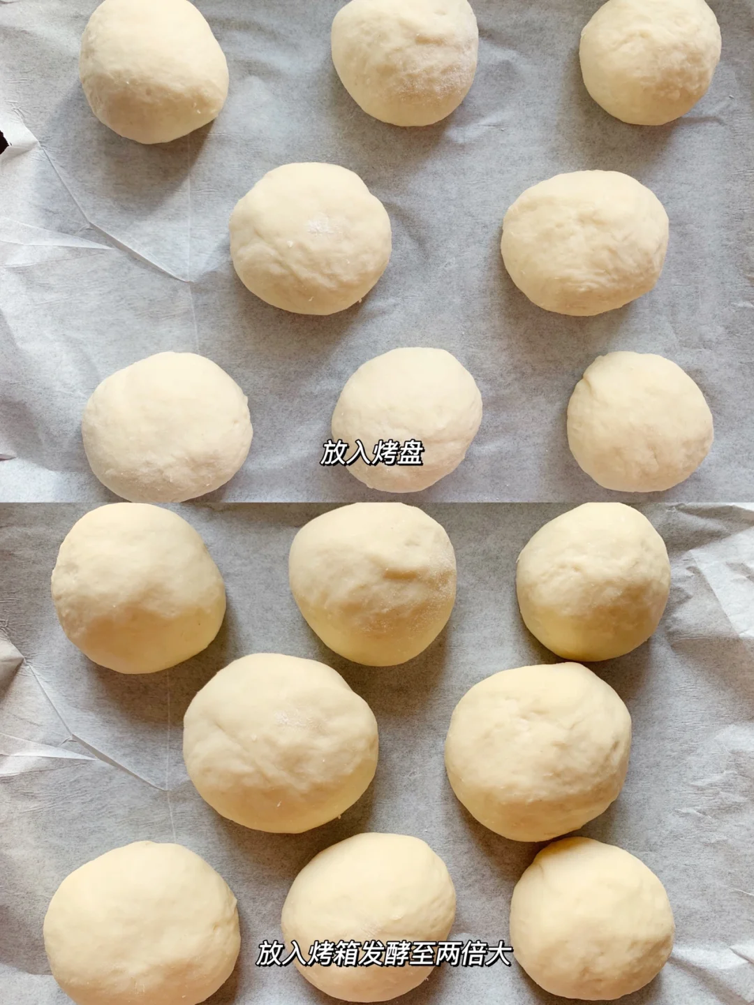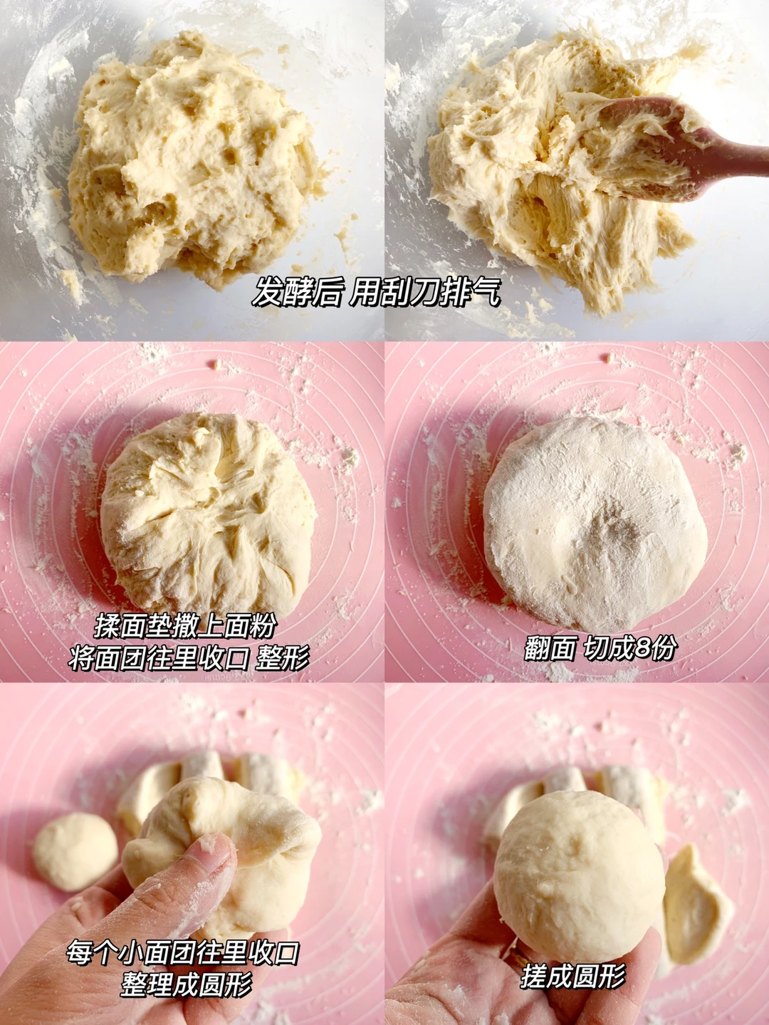 3⃣️揉面垫上撒上面粉,将面团往里收口整理成圆形,翻面切成八份,将那个面团往里折叠,捏合收口,整理成圆形,放入烤盘,放入烤箱发酵至两倍大(或者放温处)