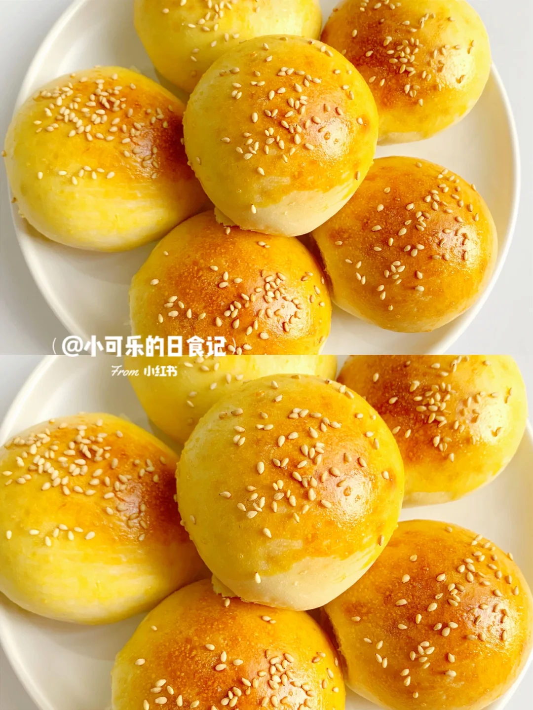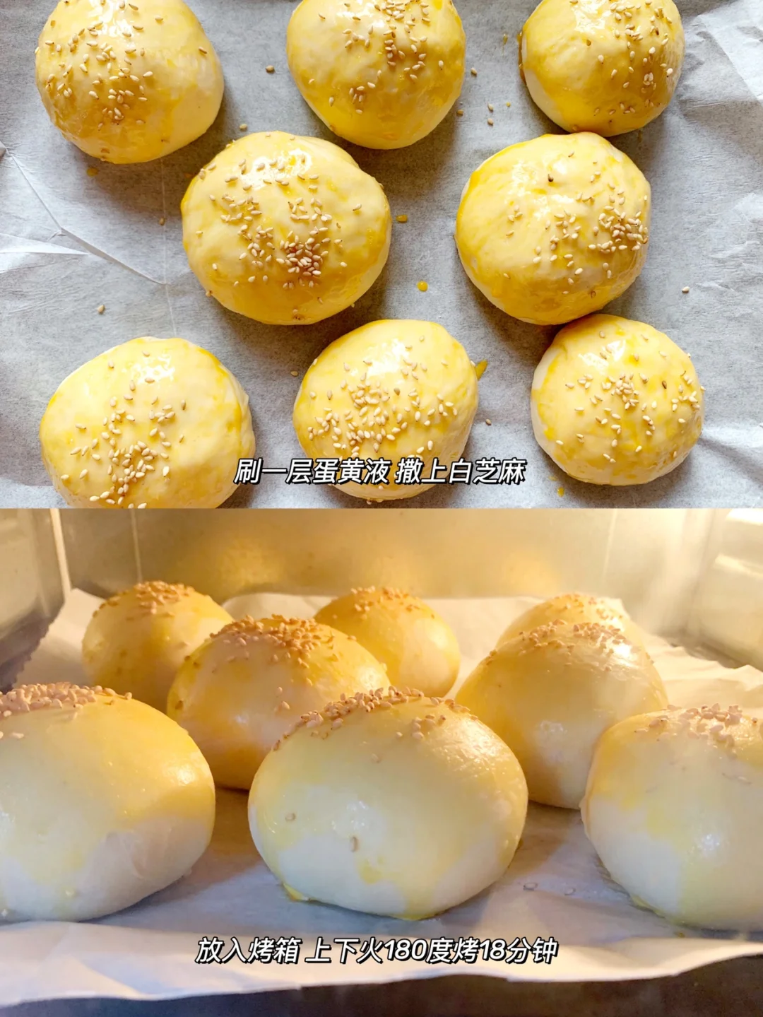 4⃣️发酵好在表面刷一蹭蛋黄液,撒上白芝麻,烤箱提前预热,放入烤箱上下火180度烤18分钟