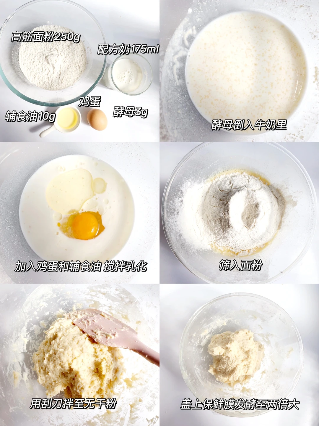 1⃣️酵母倒入配方奶中,搅拌均匀,再加入鸡蛋和牛奶,搅拌乳化