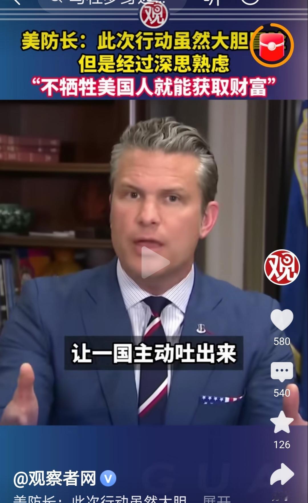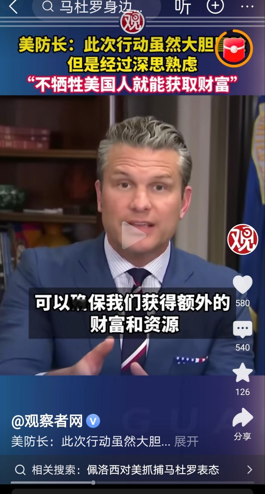 美国不装了!对在委内瑞拉的军事行动目的,没有任何外交言词,美国国防部长直接和盘托出。 美国国防部长赫格塞思对在委内瑞拉的军事行动目的直白大致说道,美国以血的代价投入发经济却难以回报,而对委内瑞拉经过深思熟虑大胆的军事行动,不必牺牲美国人的鲜血就让一国主动吐出来,可以确保我们获得获外财富和资源。 这么直白果然是强盗后代,直接暴露出帝国主义的本质。现在明白为什么“绑架”走马杜罗夫妇了吗?说白了就是绑架拿“赎金”!“绑架”委内瑞拉总统以威胁委内瑞拉吐出石油资源,这就是所谓美国要获得的“财富”。 其实,真让人想不到,一个超级大国、科技强国,还标榜着法制社会、所谓人类的文明“灯塔”等,竟然无视国际法干起了“绑架勒索”的勾当,然而,当心多行不义必自毙。