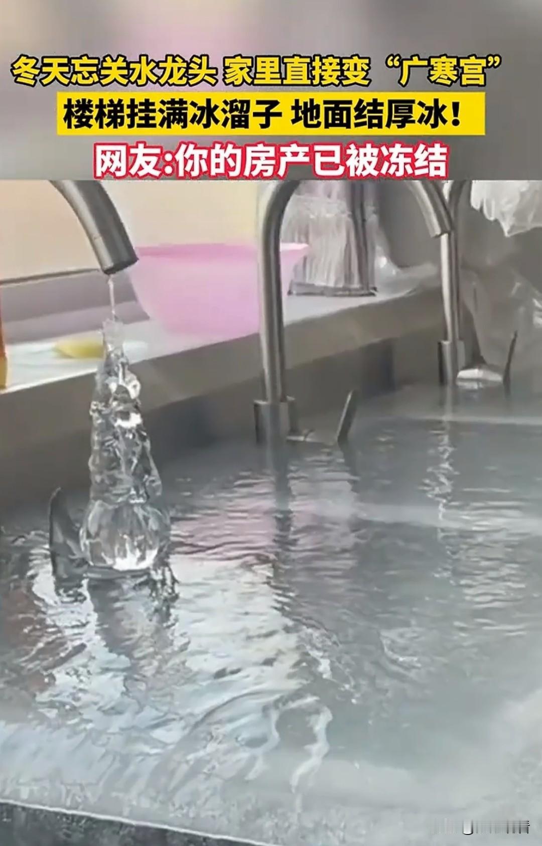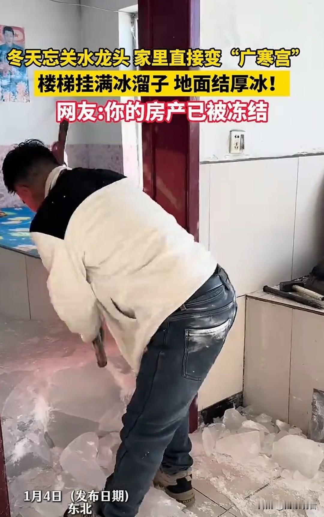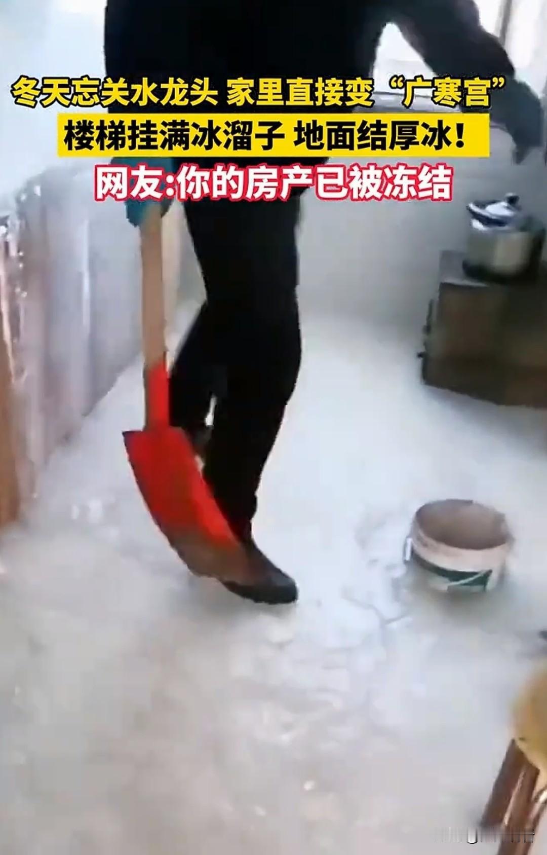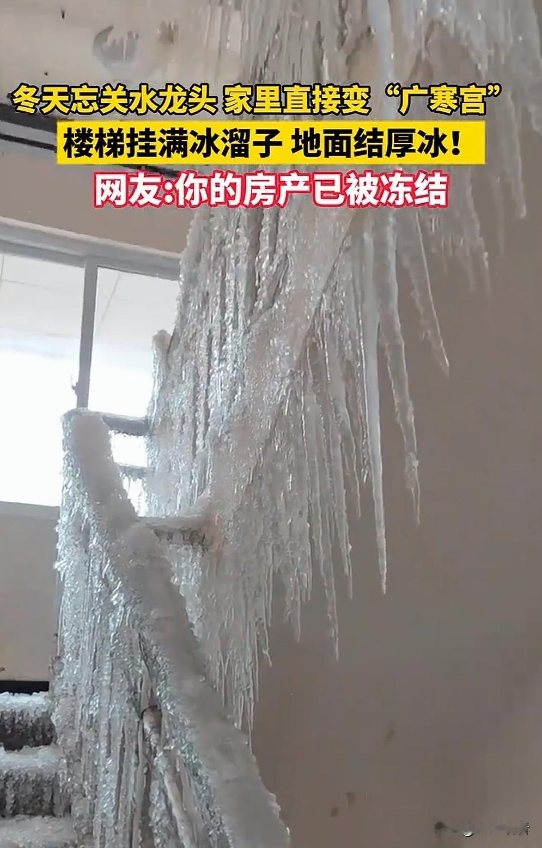 东北忘关水龙头,家直接冻成冰山🧊笑不活了 东北冬天的硬核暴击😂 忘关水龙头的后果也太惨烈了!! 家里水管冻裂渗水,全屋地面结满厚厚冰层,楼梯扶手+墙面挂满巨型冰溜子,从里到外彻彻底底冻住,妥妥现实版广寒宫❄️ 冰柱垂落、冰层封门,推门都费劲!网友神评论笑晕:你的房产已被成功冻结🧊 东北的冬天,主打一个物理速冻,杀伤力MAX! 入冬保命必修课:睡前必检查水龙头!!