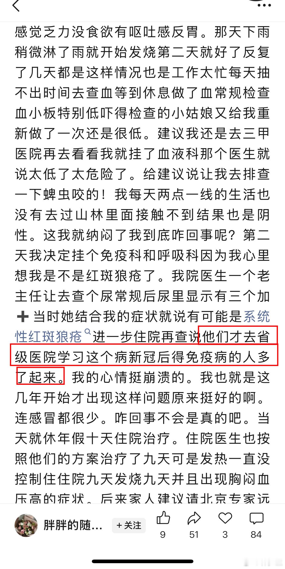 护士新冠感染后,获得系统性红斑狼疮。当年放开,医护是第一批阳的。她的症状轻微,只是低烧,一两天就好了。她还想着“这可怕的新冠也不过如此”。完了,高峰期过后,她就开始出现眩晕症状。从2023年第一次犯病,到25年,平均7个月犯一次癫痫,图2。直到他们医院的一个老主任,提示她可能是系统性红斑狼疮,图3。✨“说他们才去省级医院学习这个病新冠后得免疫病的人多了起来”评论区,还有一位当年支援的医生留言,图4。医生支援回来,也得了这个病。