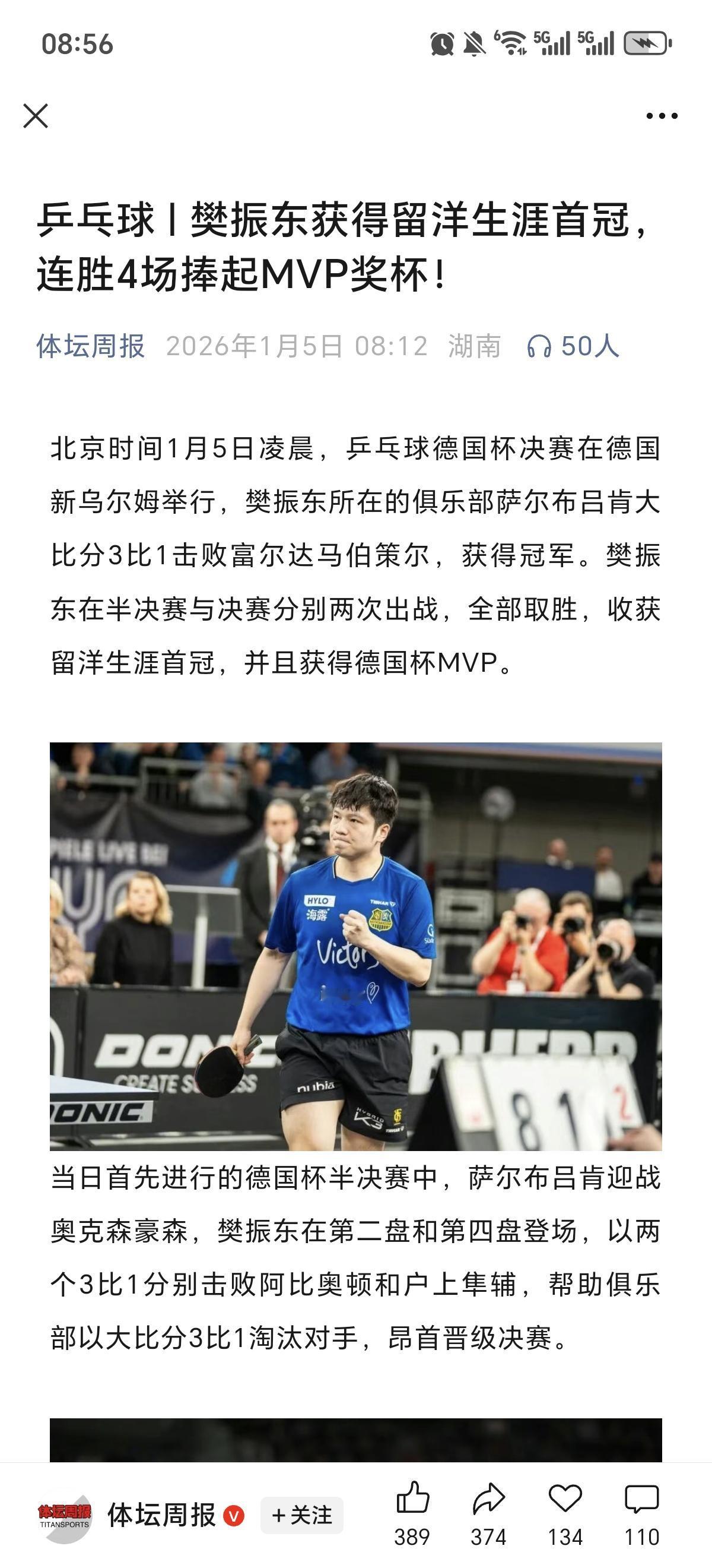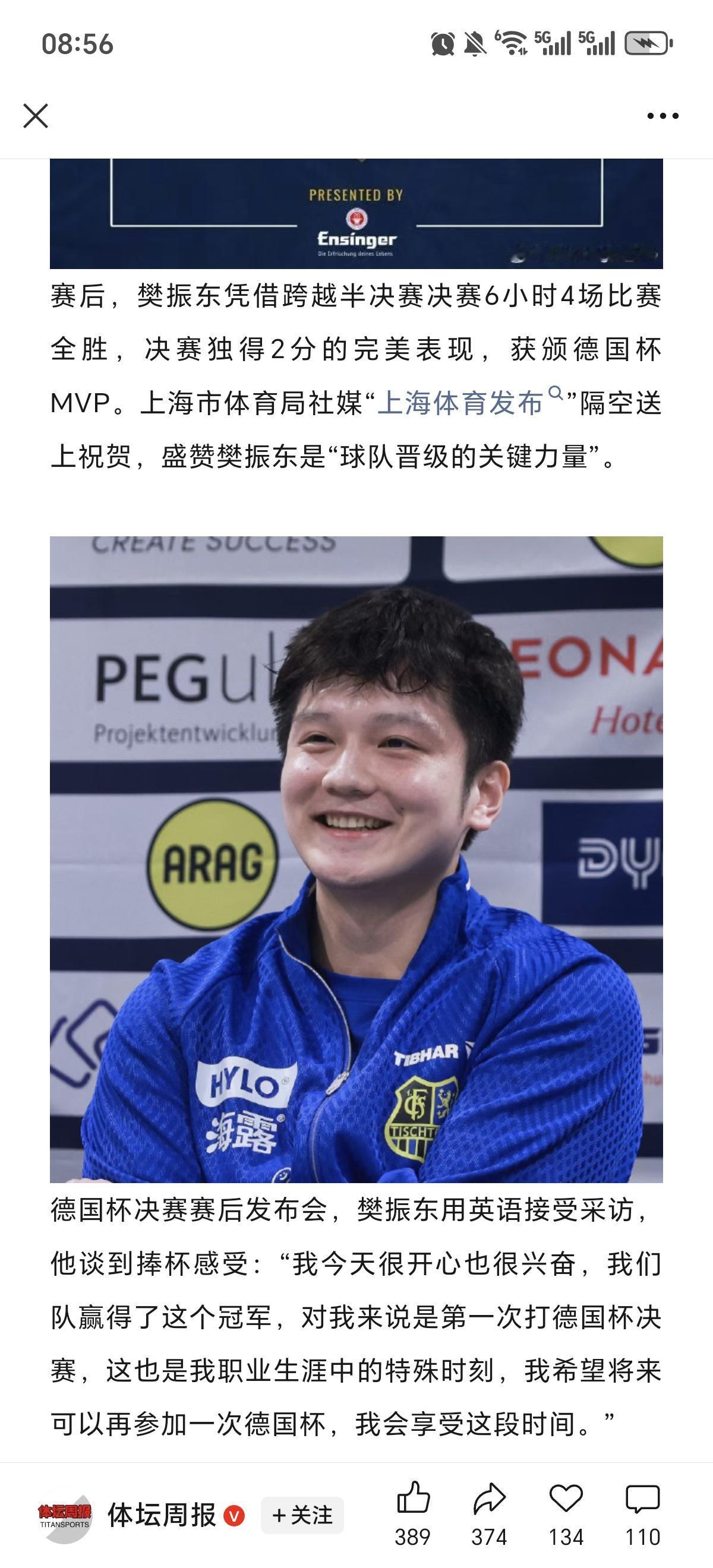 从小胖、东哥到今天的“凯撒樊”,樊振东让世界认识了乒乓球的真正魅力所在。 乒乓球德国杯赛,樊振东以半决赛胜两场两分,决赛胜两场两分的优异表现,帮助所在俱乐部轻松夺得冠军,并毫无争议的获得本届赛事的MVP,不得不说:“优秀的人在哪里都优秀,打遍天下无敌手”。 樊振东不仅在全场最白,最耀眼,也最能打,蓝色球衣衬托下更加熠熠闪光。 看到樊振东快乐打球,依然站在最顶峰,作为一个看了小胖十几年的老球迷太为他高兴了。樊振东不缺冠军,他的冠军奖杯和金牌该装满一个房间了,但他对乒乓球的热爱与理解仍然与日俱增,没有丝毫减少或者降低,可以说,樊振东是乒乓球界独一无二的伟大传奇球员! 现在,这位传奇球员的传奇故事仍在在持续中…