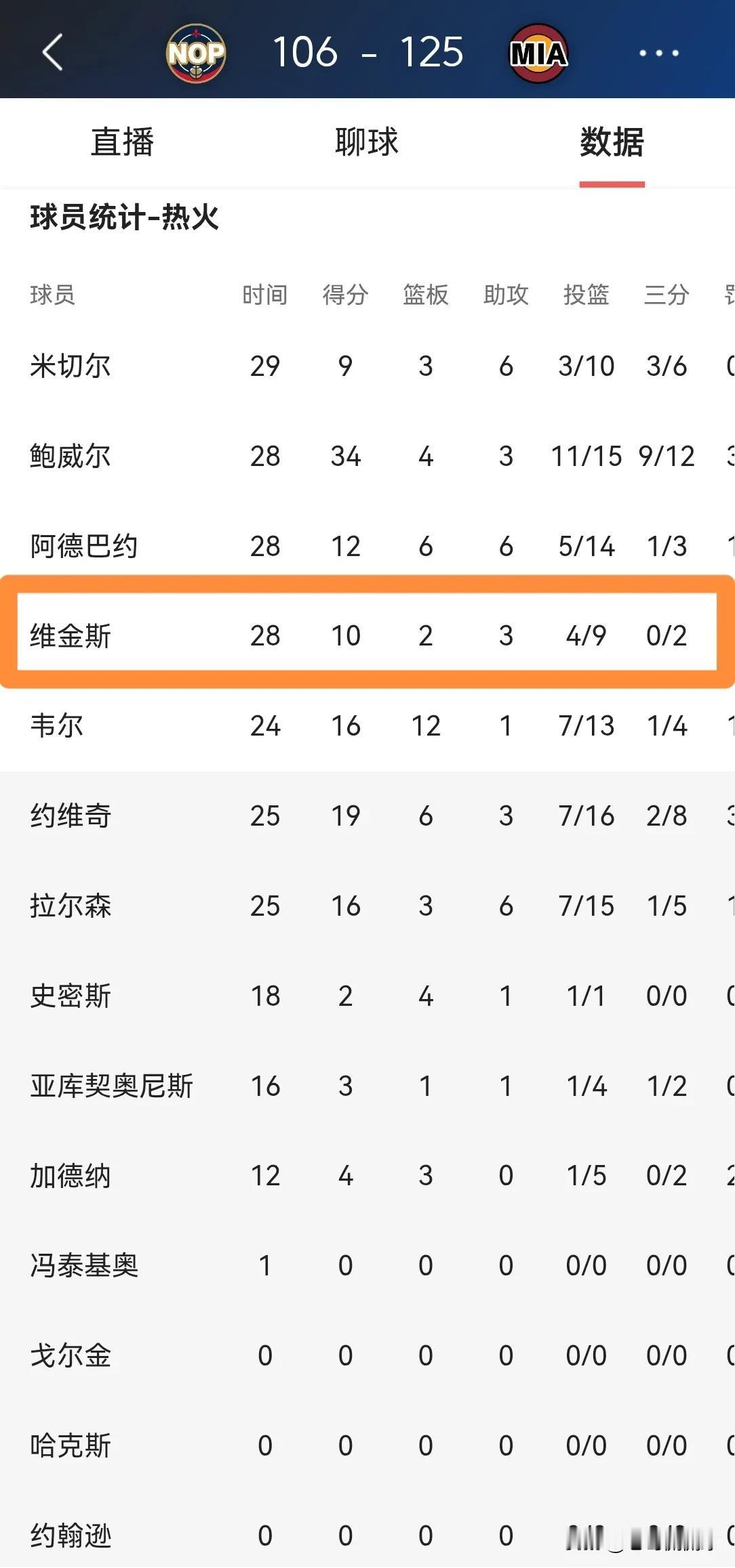 热火大将维金斯距离被交易已经越来越近了!在今天热火主场以125:106击败鹈鹕的比赛中,维金斯仅仅得到可怜的10分,他竟然连自己的赛季平均分都没有达到。 整场比赛下来,维金斯首发出战28分钟,投篮9中4,其中三分球2中0、罚球2中2仅仅得到10分,还有2次失误,他的场上正负值为首发阵容里最低的+2。 毫不夸张的说,如果维金斯在接下来的比赛中无法改进自己的表现,那么他距离被交易已经越来越近了。