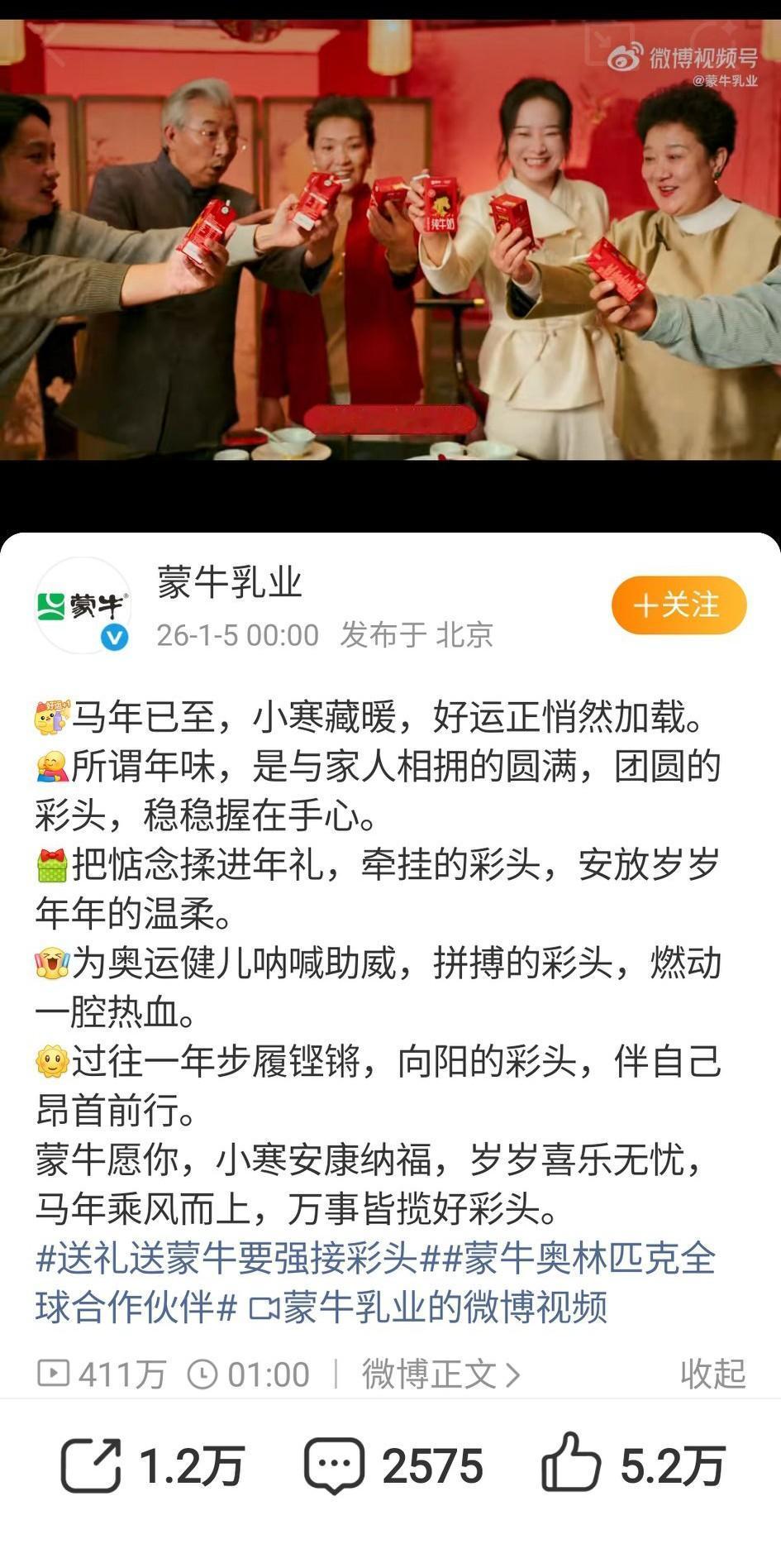 蒙牛陪你马年揽好彩头,开启美好新程! 蒙牛乳品 家人们,马年的钟声已经敲响,小寒带着丝丝暖意,悄悄为我们加载着好运。在这个充满希望的时刻,你是否也感受到了那扑面而来的年味和满满的期待? 不知道大家有没有发现,年味其实就藏在生活的点点滴滴里。和家人紧紧相拥,那种圆满的感觉,就像把团圆的彩头稳稳地握在手心,让人心里暖乎乎的。这让我想到,我们每个人都在追求一种归属感,而家庭的团圆就是这种归属感最直接的体现。就像蒙牛传递的理念一样,把对家人的爱和关怀融入到每一个瞬间。 再说说年礼,它不仅仅是一份礼物,更是我们对亲朋好友的惦念。把牵挂揉进年礼,就像把温柔安放在了岁岁年年。这背后其实是我们对情感交流的渴望,希望通过一份精心准备的礼物,传达我们内心深处的关怀。而蒙牛,无疑是这份年礼的绝佳选择。 为奥运健儿呐喊助威,那拼搏的彩头,燃动了我们每个人的一腔热血。这体现了我们对体育精神的敬仰,对拼搏奋斗的认同。蒙牛作为奥林匹克全球合作伙伴,一直与奥运精神同行,激励着我们在生活中也要勇往直前。 过去的一年,我们都走得很坚定,向阳的彩头一直陪伴着我们昂首前行。新的一年,有蒙牛相伴,我们更有信心乘风而上。 家人们,你们今年准备用什么方式迎接马年,揽到属于自己的好彩头呢?快来评论区分享一下吧!社会百态 社会新闻