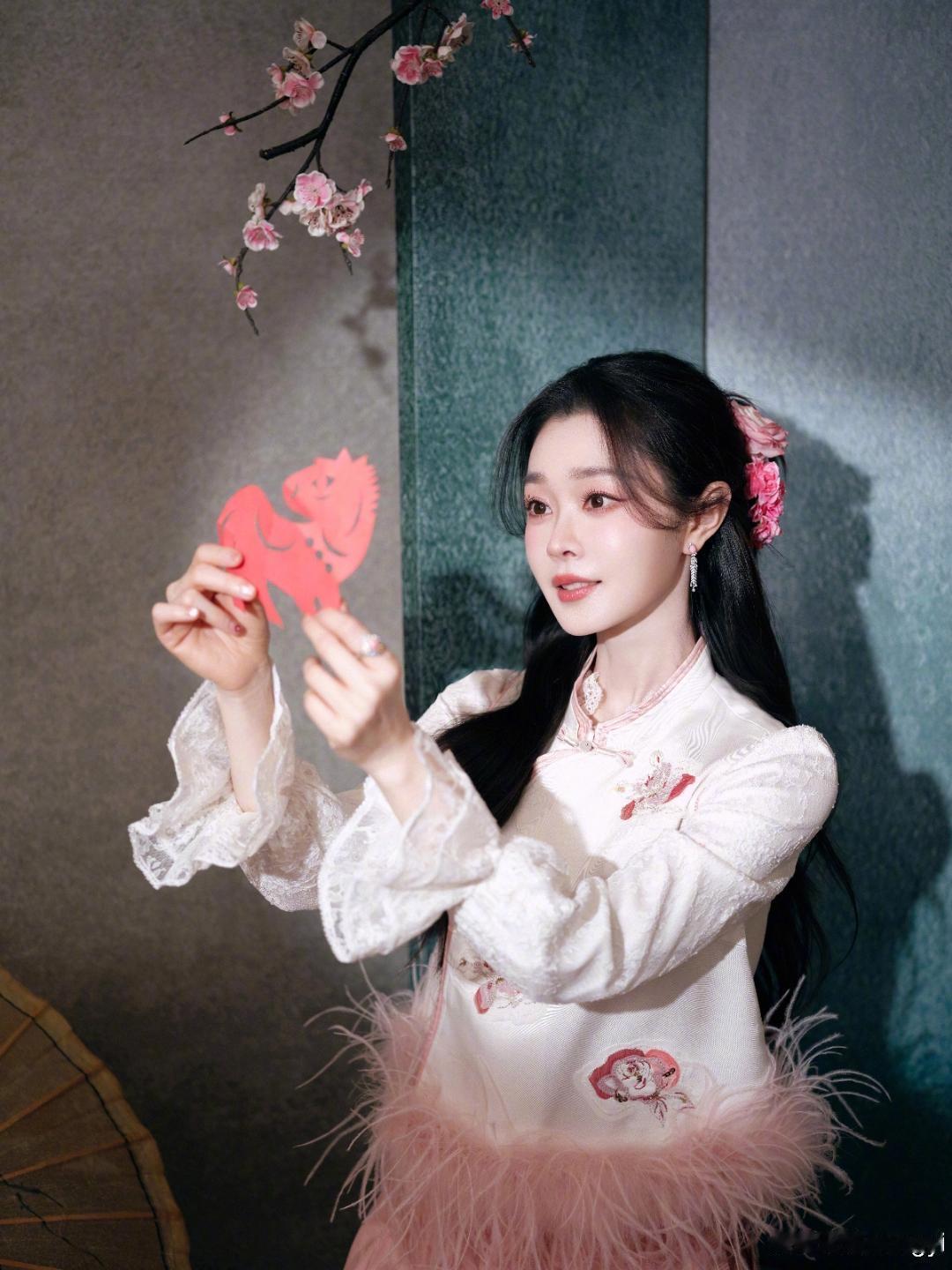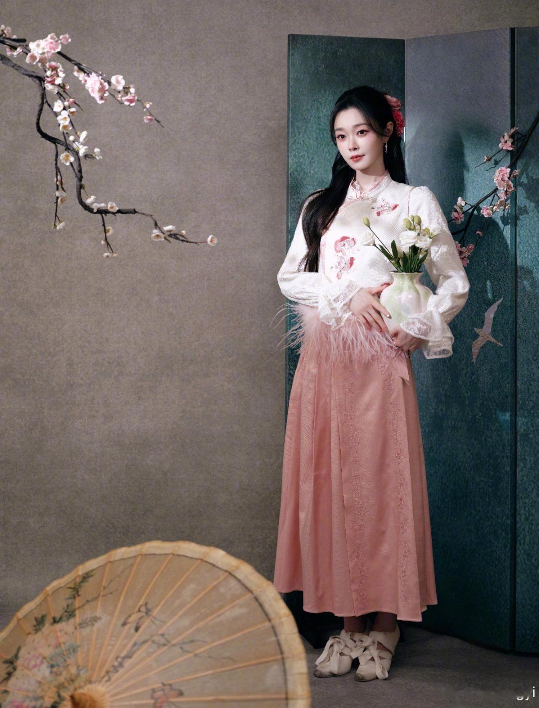 梅枝映影的雅致场景里,宋轶以一袭新中式造型勾勒出东方美学的温婉诗意。 白色提花上衣缀着细腻的刺绣纹样,蕾丝喇叭袖轻垂如蝶翼,领口的盘扣藏着古典韵味,腰间的粉色羽毛与同色系纱裙衔接得恰到好处,柔粉与雅白碰撞,既保有中式服饰的含蓄,又添了几分灵动的少女感。发间簪着的粉花,与手中绘梅的团扇、雕花的油纸伞相映,茶盏、剪纸等小物点缀其间,将中式庭院的闲情逸致揉进了画面。