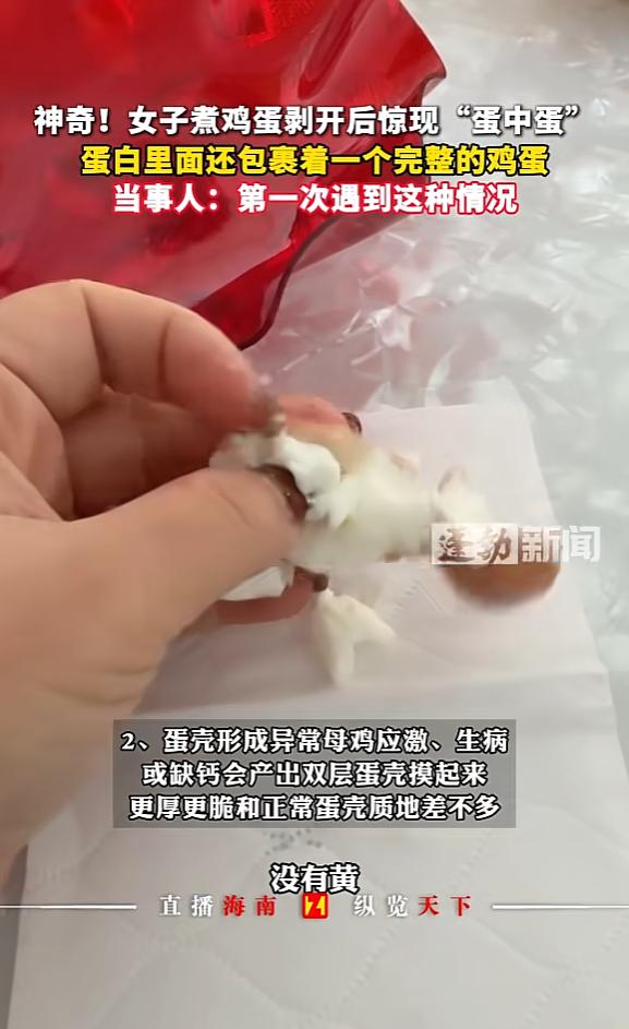 近日,山东威海,一女子吃鸡蛋时,剥开蛋白后,发现里面并不是蛋黄,而是一枚完整的小鸡蛋,这让女子觉得惊奇,拿出来仔细观察后,发现里面并没有蛋黄,害怕吃了出问题,女子还是将整个蛋扔掉了。 麻烦各位读者点一下右上角的“关注”,留下您的精彩评论与大家一同探讨,感谢您的强烈支持! 家里养的土鸡,带来的惊喜总是出乎意料。山东威海的邢女士最近遇到了一件新鲜事,差点让她怀疑自己是不是眼花了。 那天一早,她像往常一样准备早餐,锅里煮着几只自家的鸡蛋。鸡蛋是母亲从老家的院子里捡回来的,平时邢女士最喜欢吃这种散养鸡下的蛋,不仅味道好,还让她觉得踏实。 谁知,早餐时分,剥开煮熟的鸡蛋,她突然觉得手感有点奇怪。蛋壳剥开后,蛋白里竟藏着一个更小的鸡蛋。 她顿时愣住了。仔细一看,这个小鸡蛋外形完整,壳也是硬的,只是体积比普通鸡蛋小了不少。 好奇心驱使下,邢女士又剥开了这个“蛋中蛋”,结果发现里面竟然什么都没有,不见蛋黄也没有蛋白,只剩一个空壳。 这一幕让她哭笑不得。她本来还想着要不要尝尝“蛋中蛋”的味道,可看到里面空空如也,反而担心是不是鸡蛋出了什么问题。 毕竟,民间流传着不少关于“怪异鸡蛋不能吃”的说法,为了保险起见,邢女士还是选择把这枚特殊的鸡蛋扔掉了。 不过,这样的“奇观”她可不舍得就此忘记,立刻用手机拍了照片,发到了家人群里,还顺手发到社交平台上,让大家见识一下自家土鸡的“魔法”。 照片发出去后,亲戚朋友们都觉得新鲜,有人笑称这是“鸡蛋里的套娃”,还有人说她遇上了“稀罕物”。甚至有网友留言,自己活了这么多年都没见过,表示这种事堪比中彩票。 可是,面对网友的各种猜测,邢女士心里还是有些不安,终究还是把这个鸡蛋给扔了。 但是她非常疑惑,又查阅了一些资料,才发现“蛋中蛋”其实早有科学解释。原来,母鸡在产蛋过程中,有时候由于受到外界刺激,已经成型的鸡蛋没有及时排出体外,反而被鸡体当成了新蛋胚,重新包裹了一层蛋清甚至蛋壳,这样就形成了“蛋中蛋”。 一般来说,蛋黄和蛋白不会同时重复生成,所以蛋中蛋往往没有蛋黄,有的甚至完全是空心的。 这样的鸡蛋对人体没有危害,但口感和营养价值也就不如普通鸡蛋了。专家还指出,这类现象在小规模散养或者鸡只较为紧张的环境下更容易出现,和饲养方式、母鸡健康状况都有关系。 这次“蛋中蛋”事件在朋友圈和社交平台引发了不少讨论。有人觉得有趣,有人表示担心,也有人回忆起小时候养鸡时遇到的类似情景。 不难发现,随着城市化推进,像邢女士家这样自养土鸡的家庭已经不多了,遇到“蛋中蛋”这种“小概率事件”,反而成了新鲜事。 在当前食品安全话题日益被重视的背景下,人们对“自然产物”有了更多的好奇和敬畏。鸡蛋作为日常餐桌上的常见食材,背后复杂的生物学过程其实很少有人真正了解。 一次偶遇的“蛋中蛋”,不仅让邢女士和网友们开了眼界,还让更多人意识到,哪怕是最普通的食物,都有着不为人知的生命故事。 你有没有遇到过类似的“蛋中蛋”或者其他奇特的农产品? 信源:《神奇!女子煮鸡蛋剥开后惊现“蛋中蛋”,蛋白里面还包裹着,一个完整的鸡蛋,当事人:第一次遇到这种情况》——荔枝新闻