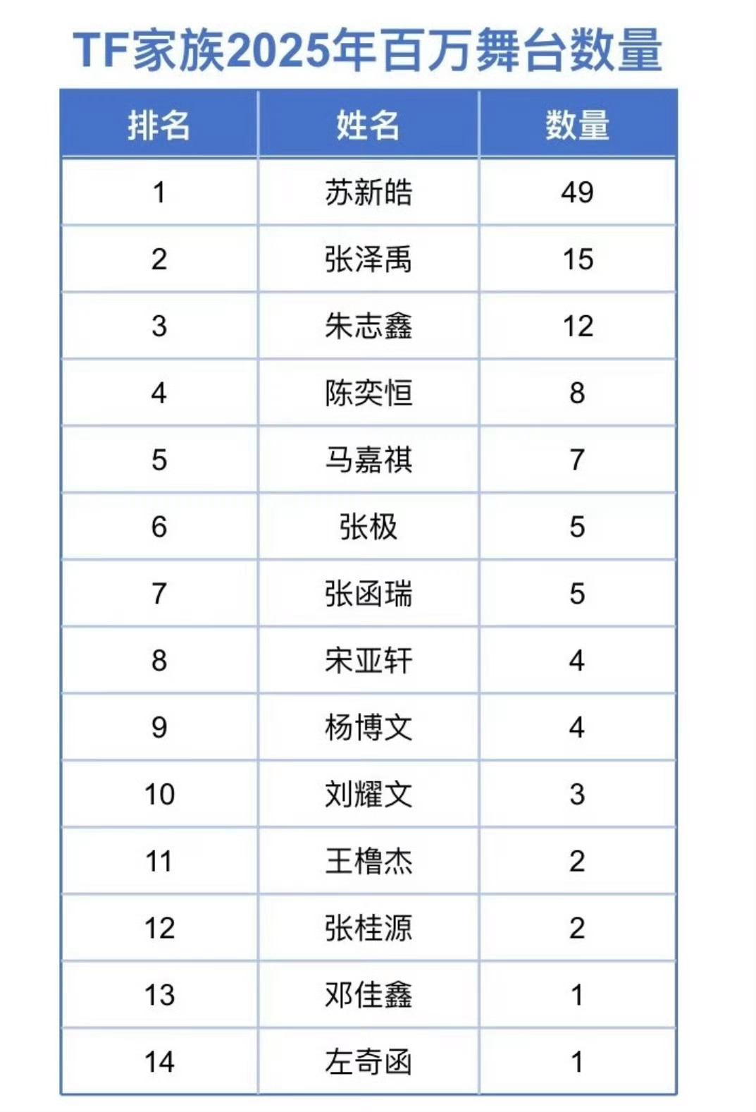 【百万舞台】TF家族2025年百万舞台 TF家族2025年百万舞台数量,苏新皓以49个百万舞台断层第一,四代陈奕恒8个最多。苏新皓 > 张泽禹 > 朱志鑫 > 陈奕恒 > 马嘉祺 > 张极 = 张函瑞 > 宋亚轩 = 杨博文 > 刘耀文 > 王橹杰 = 张桂源 > 邓佳鑫 = 左奇函TF家族2025年百万舞台统计