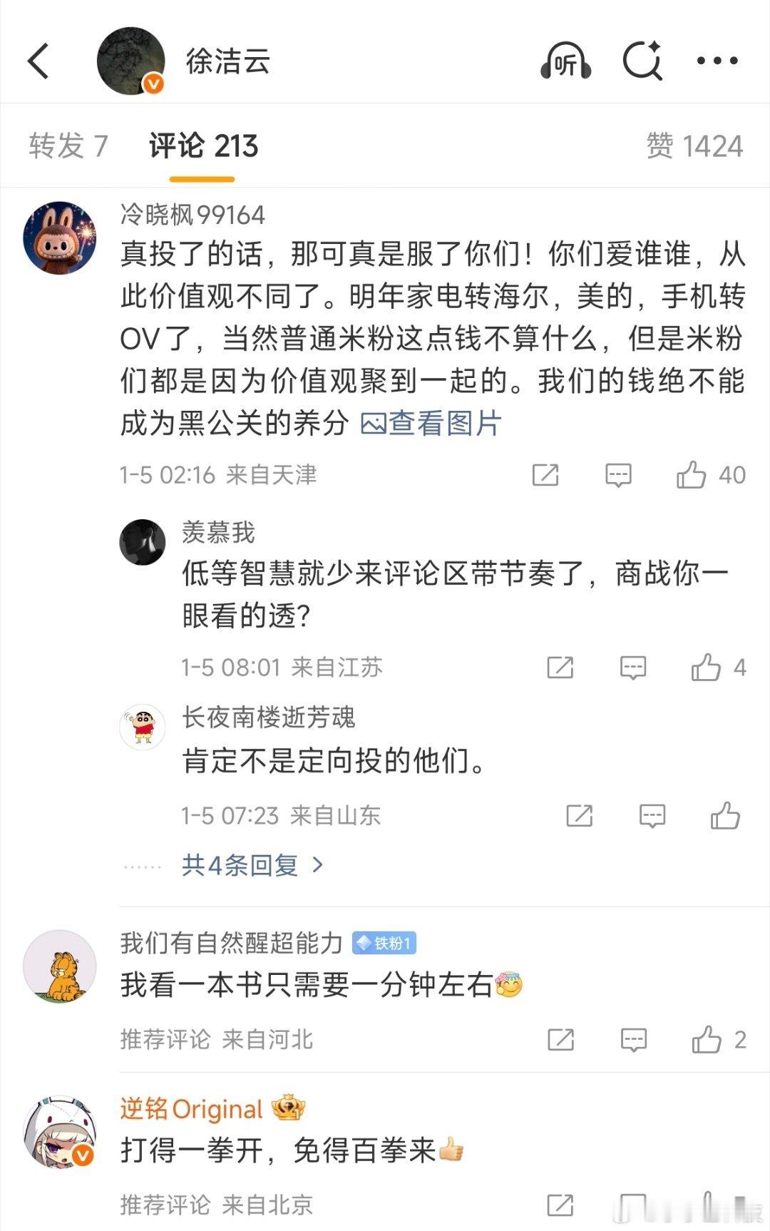 很多米粉喜欢小米、转发小米、辟谣小米谣言,大部分都是自发行为,他们发自内心的喜欢雷军、小米公司的价值观。为什么徐洁云评论区会有很多米粉气愤,从他们的只言片语就能理解,也能感受到他们的愤怒,其中也有很多小米股票的股东。很理解小米在遭受舆论攻击时的无奈,分身乏力,连雷总都不得不禁声,用了八九个多月才缓过来,重新找回了节奏和自信。对于那些长时间阴阳小米、抹黑、造谣的大V,他们的确有影响力,肯定比普通米粉的声量大,小米想通过投放让他们停止对小米的恶意诋毁,这种策略非常理解但不赞同。对于抹黑、造谣、阴阳小米、雷军的网友、大V博主,你们要做的是用法律武器维护权益,而不是用投放给钱来堵住他们的嘴巴,这些博主的粉丝群体已经固化了,投放他们换来的只是无尽的嘲讽。与其把他们收入麾下,不如把这些钱折合成礼品抽奖给粉丝们,线下举办活动,让那些真正喜欢小米的受益。给网络黑嘴交保护费,这不是解决办法,他们是探不到底的无底洞…… 此内容不针对任何人,只谈论发生的事情,如若对号入座,纯属巧合。