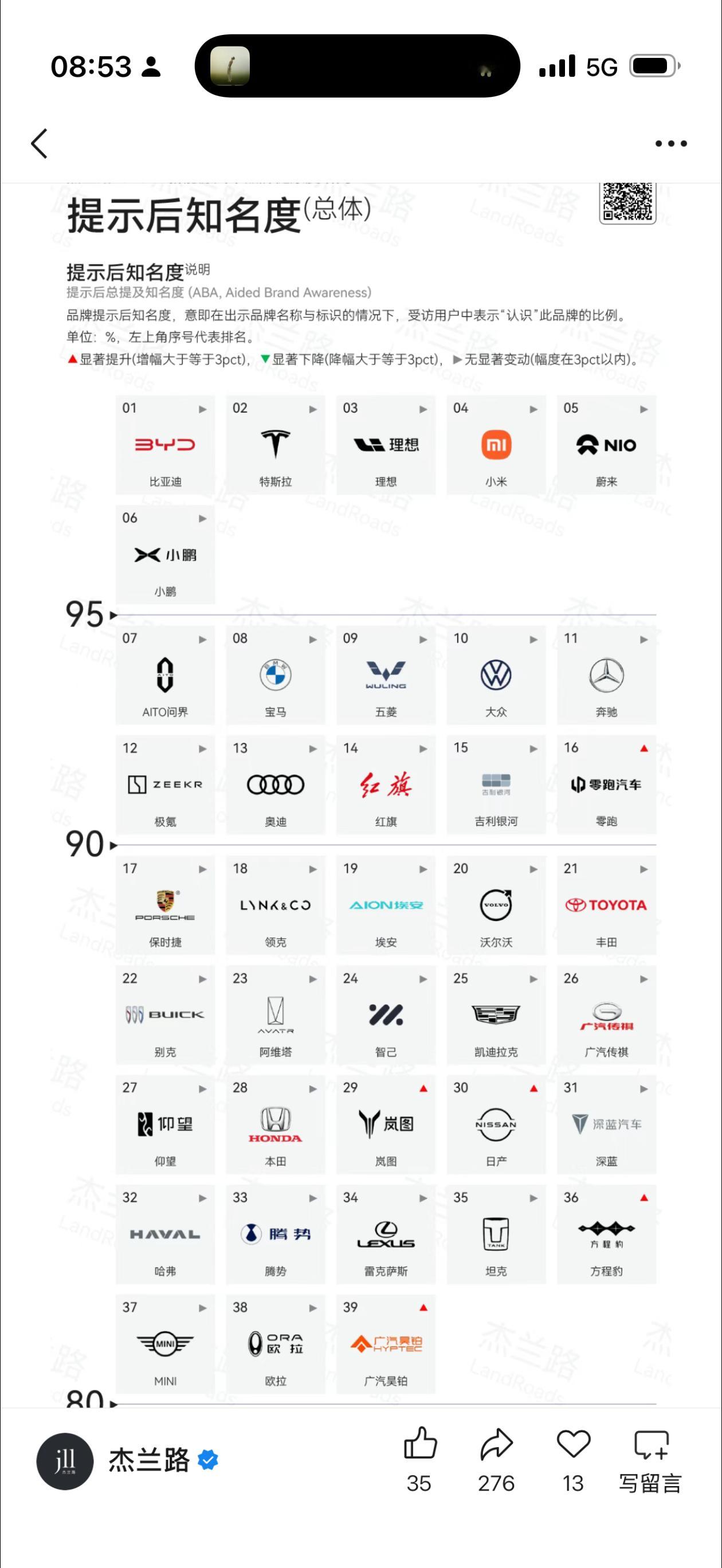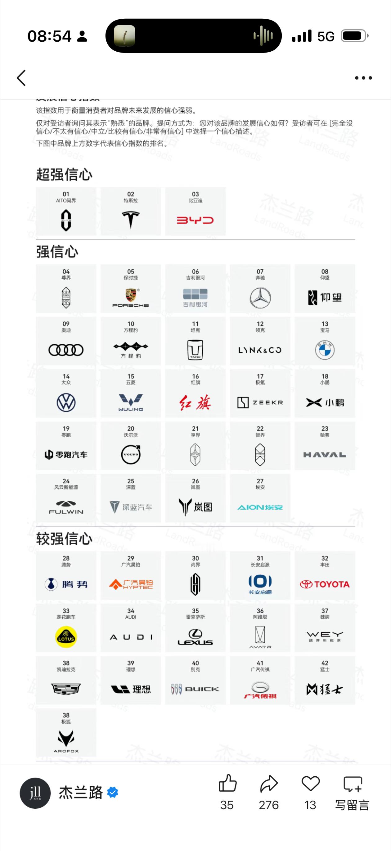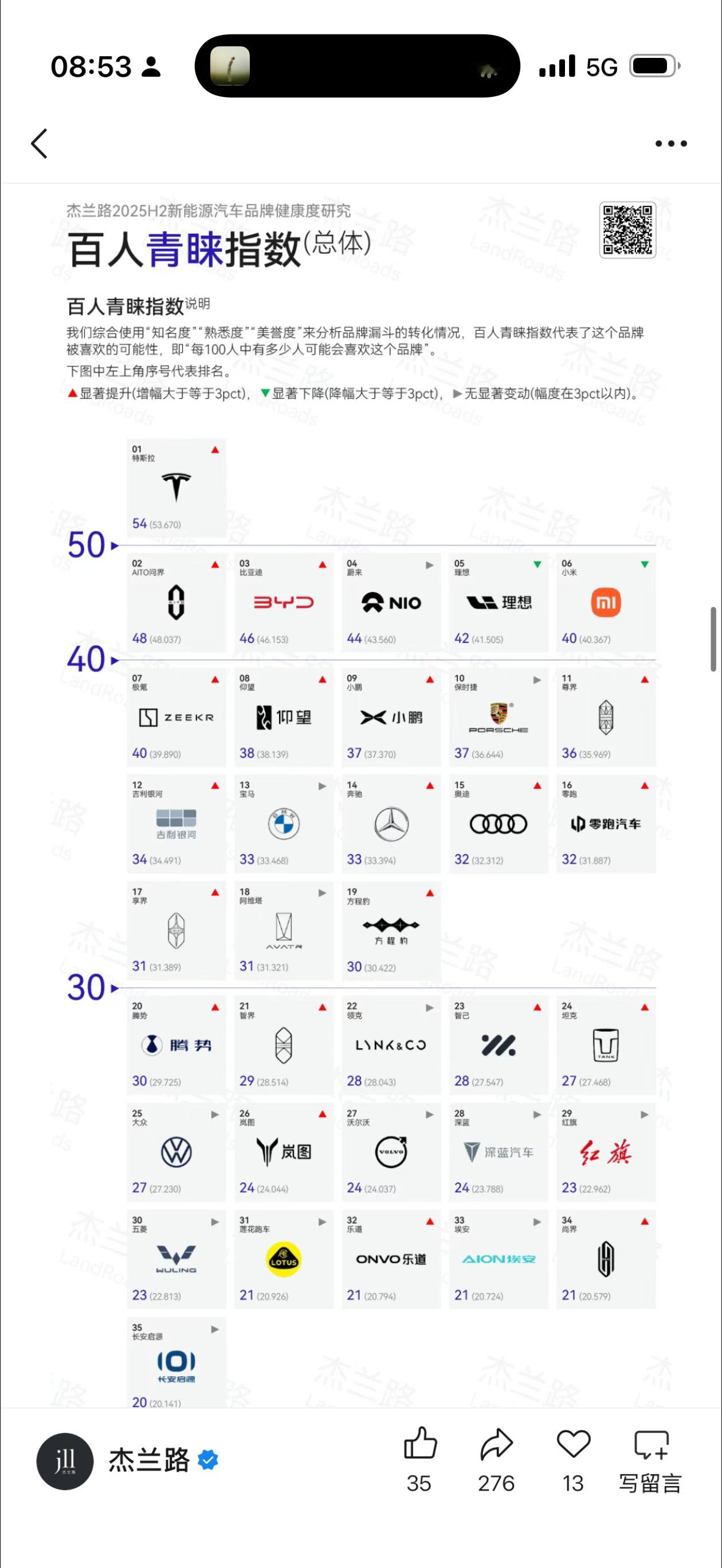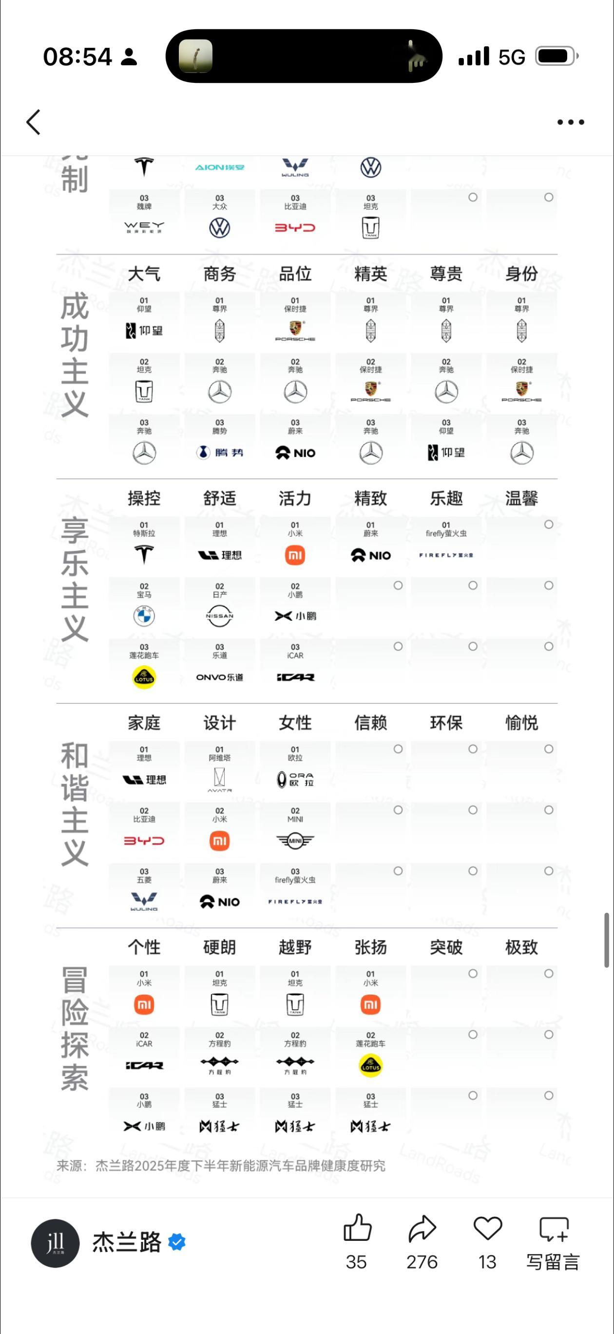 杰兰路 2025 下半年新能源汽车健康报告,几个指标亮了。知名度上,比亚迪特斯拉遥遥领先,这和他们销量匹配,说明知名度是销量的前提。而理想和蔚来销量和知名度不匹配,说明只有知名度还不够。信心指数上,看得出来大家对传统品牌的信心还是强于新势力,虽然这里面很多品牌资产和现金其实比新势力好不到哪去,理想都只能排 30 开外,蔚来甚至没上榜。 品牌形象上,理想这是把“家庭和舒适”焊死了,这是优势也是劣势。优势就是得继续把长板加长,劣势就是扩大用户群难度高,当然想开点,一个品牌有一个特别强的形象标签,比什么都没有或者哪里都沾一点强。2026,大家继续加油吧!