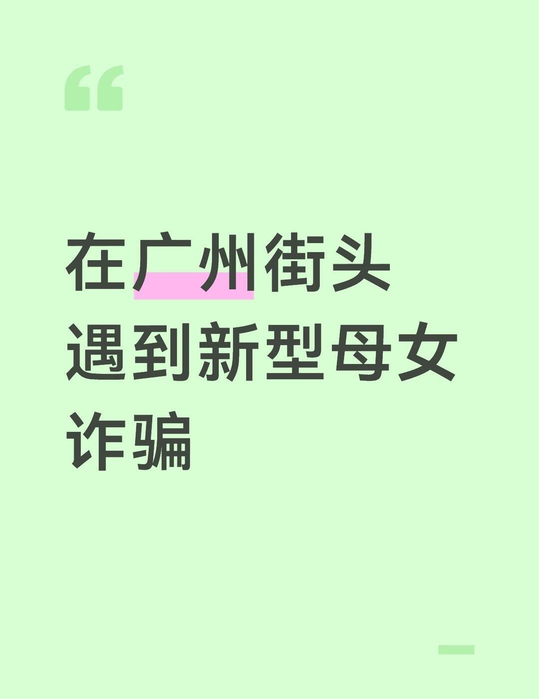 在广州街头疑似遇到新型母女诈骗(已报警) 刚才从车陂棠东走回家的路上遇到一对“母女”。这个“母亲”是一个中年妇女,画了眼妆眉妆,穿着体面,湖北口音,她推着婴儿车,里面坐着她的“女儿”。 我当时戴着耳机,她在路中间呼喊住我,说道:“小帅哥,你可以借我二三十块钱吗?我刚刚被孩子他爸赶出来,想向你借钱吃饭。” 我当时感到有些诧异,观察了一下这位“母亲”以及小孩的装束,感觉不是特别缺钱的人。不过她说的似乎也有道理,我本来已经打算掏钱了,但是突然想起这附近二十米就有一个肯德基。于是我跟这个“母亲”说:“附近有一家肯德基,我可以带您去那家餐厅吃饭,请你们吃。” 结果那个“母亲”连连摆手,说:“不不不,你转账给我,我自己去吃就行了。” 这个时候我就起了疑心,一方面是她口是心非,明明是想吃饭但是却又不去,只想要钱;另一方面是她明明有微信,却在大街上找一个陌生人要钱,这在现代社会中简直是不可想象的(毕竟大部分人都是有家人和朋友可以借钱的)。于是我开始从言语上试探她,想观察她到底是什么来头。这时候她看我不肯给钱,已经开始不耐烦并道德绑架我。 这个时候我心里已经有数了,因为车陂到棠东的这个路段是著名的骗子路段,我从小在这里长大,遇见过了五六种骗局,养成了良好的防骗意识。情况一旦来到了“给钱”,十有八九是骗局。 后面我拒绝了她的要求,她狠狠说不找我这种没素质的年轻人要钱。说罢就去找其他人重复这套流程了。 回家之后,我越想越不对:既然这个所谓的“母亲”是个骗子,那么她婴儿车里面的“女儿”是不是也可能是假的呢?想到这,我不寒而栗,随即打电话报警了。目前派出所正在调查这个事情。 新型诈骗手段 小心人贩子 广州车陂棠东骏景花园
