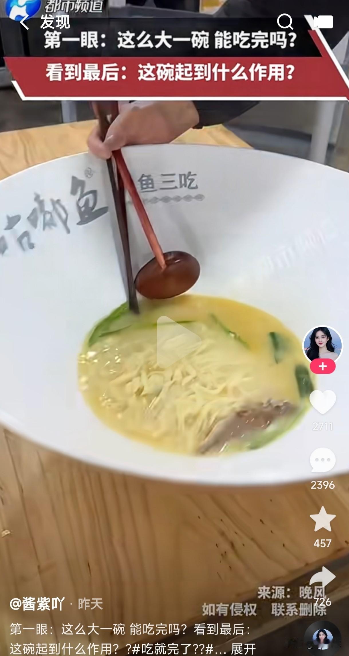 远看像锅一样大的碗,心想这一碗是不是好几顿都吃不完,端上桌的那一刻瞬间傻眼了,碗大面少这是什么操作? 不知道店家搞如此大的碗是为了显的分量很足,还是大碗显的高档大气上档次?但这碗底的量着实惊人,我以为差不多肯定得有半碗,谁能想到只有一碗底的量,这是壳大肉少的操作吗?不懂这吃法的人还以为店家是不是把锅端上桌了,如此大的碗还用推车上餐,端上桌的那一刻是不是感觉有点糊弄人的意思? 吃饭吃的就是与众不同,吃的就是独特的口味,这像锅一样大的碗,分量只有一丢丢的量,这到底吃的是仪式感?还是吃的脑容量?碗 饭店餐馆碗 大口面碗