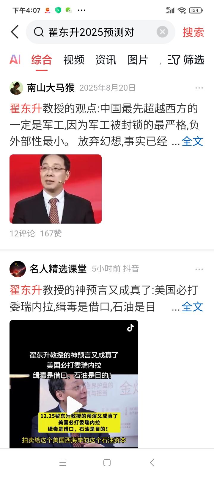 翟东升教授绝对是真正的预言大师, 去年,他在一个节目中说,美国必打委内瑞拉,当时美委有和谈迹象,而其他两个嘉宾,并不完全同意这个观点, 1月3日,美军入侵并逮捕马杜罗。 三年以前,翟教授说,中国最先超过美国的,很可能是军事,至少在军事工业的某一方面,能领先美国,这一观点当时遭到了嘲笑, 去年,中国第六代战机率先试飞。 2014年,在香港一个论坛,翟教授说,美国将率先与中国脱钩,中国要早做准备,他的这一观点,与会的多位嘉宾,没有一个赞同, 从2018年开始,美国发起贸易战,开始脱钩。 事实证明,翟教授的分析,精确的令人咋舌,这样的人,才是国家的智囊。 现在的问题是,我们仍然能够见到张维迎许小年之类的伪经济大师占据各大论坛,而他们的分析和预测,每一次都是完全错误, 可笑的是,这两位从来不认为自己能力不行,相反对自己勇于批判的精神超级自信。