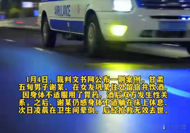甘肃,一男子在女友家留宿,感觉胃部不大舒服就吃了药,之后二人还发生了一些亲密的关系。滚完床单之后,男子身体还是不大舒服就躺在床上休息。第二天凌晨的时候,女友发现男子昏倒在卫生间,拜托邻居帮忙将男子抬到床上,之后才拨打120急救。可惜的是,男子并没有没有抢救过来。 大风新闻1月4日报道了这则新闻。据报道称,事后男子的家属就把女子给上诉了,理由是女子没有尽到救助义务,她需要担责。 一男子谢某,其年龄五十多岁,交到了一位女友巩某,二人经常居住在一起。事发这一天,谢某又来到女友的住处留宿。 二人见面,感情肯定是很浓厚的,谢某就提出想要喝点小酒,女友也就陪她小酌了一会。吃完饭、喝完酒,谢某却感觉身体有点不大舒服。 因为平时也有胃痛的情况,谢某就让女友拿出了胃药吃。吃完之后,谢某又来了精神,抱着女友就发生了亲密的关系。 俩人感情你侬我侬,一番激烈的情感交流之后,谢某就准备睡觉了。但是这个时候,他跟女友说,感觉胃部还是不大舒服,女友就让他喝了点温水、然后躺在床上休息一下。 谢某稍微躺了一会,没多久就昏昏睡去,而一旁的女友看到他睡着了,也就关灯睡觉了。大概到了凌晨时分,巩某突然惊醒了,她发现身旁的男友不见了。 巩某立刻就打开灯,满屋子里找男友。最后在洗手间看到了谢某的身影,但是谢某当时昏倒在洗手池旁边,整个人不省人事。 事发突然,巩某非常害怕,立刻就去敲隔壁邻居的门,请求邻居进来帮忙。邻居也很热情,二话不说就进来帮着巩某,将躺在地上的谢某给抱到了床上。 将谢某安置好了之后,巩某就立刻出门,她准备打车子外出找谢某的同事过来帮忙。与此同时,巩某这才想起来要去拨打了120,让救护车想过来急救自己的男友。 没多久,谢某的同事也赶到了,救护车也赶到了,赶到现场的医护人员赶紧对谢某展开急救,接着又把谢某给带回了医院进行抢救。 然而,经过一夜的抢救,谢某还是没有醒过来。非常遗憾,男友就这样离开了人世。巩某想想都非常害怕、后悔。 根据医院这边出示的诊断书,谢某属于猝死。去世的时候,一边的眼睛已经出现歪斜的情况。然而谢某的家属却不承认,他们将巩某给上诉了,要求巩某对谢某的死负责。 而相关部门是这样审理的,谢某是一位完全民事行为能力人,他要清楚,身体是自己的,自己才是第一责任人,是否饮酒、是否服药、是否发生关系,他自己最为清楚。 其次,巩某作为女友,对于谢某的身体状况也应该有所了解,应该做出应急举措,事发突然,不应该自己判断救助的方式,第一时间应该拨打急救电话。而巩某忙活了半天,她自己个人的救助行为,明显存在不当之处。 最后,审理之后判定,巩某在急救措施上存在过失,没有能够进到必要的救助义务,需要对谢某的离世承担10%的赔偿责任。判处巩某赔偿急救费、死亡赔偿金合计9.3万元。 本案释法:男友留宿时,突发疾病,女友采取的救助义务不当,没有及时拨打120急救,最后男友没有抢救过来离世。女友是否需要承担一定的责任呢? 根据《民典法》第1005条规定,自然人之间因为特定关系,如家庭成员、亲密伴侣,可能产生救助义务。面对突发紧急状况,需要拨打急救电话、采取必要措施等。 本案中的女友,作为谢某的亲密伴侣,在男友产生突发疾病时,通常会被认定为需要负有及时救助的义务,包括及时拨打120急救电话。 如果女友谢某明知道男友情况危急,已经丧失意识、呼吸困难,但是却因为疏忽、恐惧、或者错误判断没有及时拨打120,从法律上来说,可能会被认定为没有履行救助义务,存在过错,需要担责。 因此,女方需要承担10%的民事赔偿责任,最后需要对男友的家属做出经济赔偿。 作为亲密伴侣,需要对另一半的健康负责,如果一方出现任何的身体不适,建议还是需要尽快拨打急救电话,互相尽到安全保障义务。 对此,大家都怎么看呢?