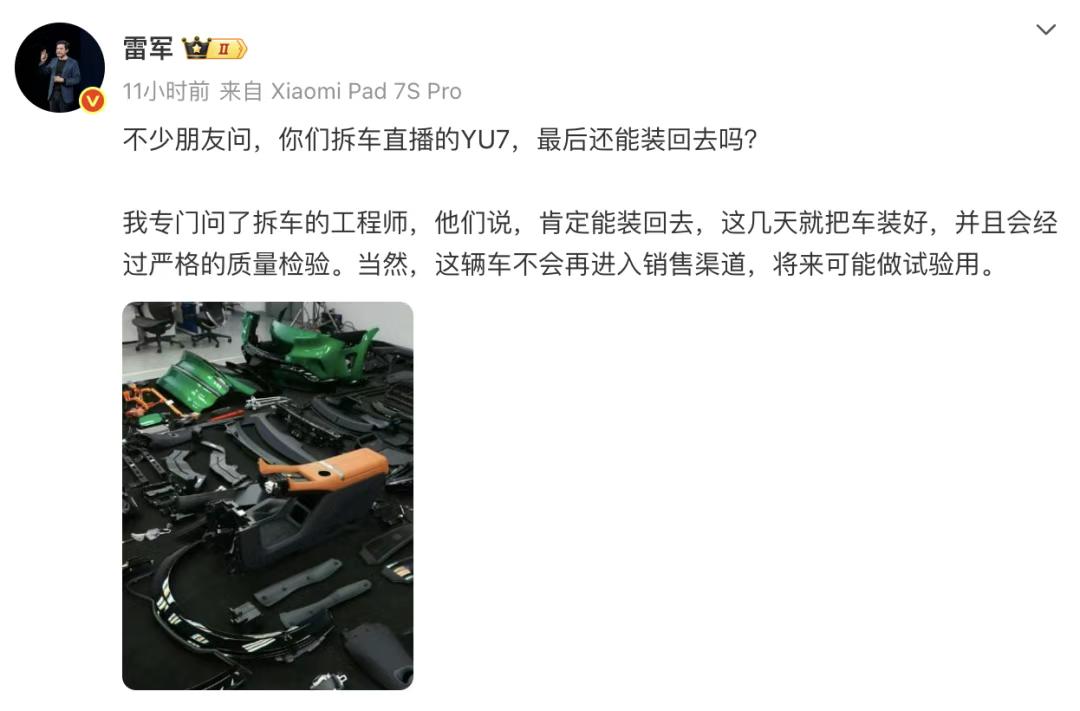 拆车直播背后,雷军在下一盘大棋! 作为车评人,看惯了厂家光鲜的发布会。但像雷军这样,直播4小时把一台崭新的小米YU7大卸八块,拆到只剩“骨架”,还真是头一遭。有人说这看不懂,但在我看,雷总这步棋,走得相当高明。 这根本不是给普通观众看的“手工课”,而是一场针对行业和舆论的“肌肉秀”。过去一年,小米汽车深陷各种质疑。雷军选择用最硬核、最透明的方式回应:把车门、座椅、防撞梁乃至2200MPa的防滚架,全部摊开给你看。特别是展示门锁的三重电源冗余,直接回应公众对电动车安全的核心焦虑——不怕撞,更不怕撞了开不了门。 更深的用意在于“立标准”。敢把车拆到这份上,就是在宣告:“我的用料和结构,经得起任何放大镜审视。”尤其在宣布今年要卖55万辆的关口,这场秀比任何广告都管用。它向潜在买家传递了一个强烈信号:选小米,不只是为生态,更是为扎实的“里子”。这波操作,接地气,更接底气。
