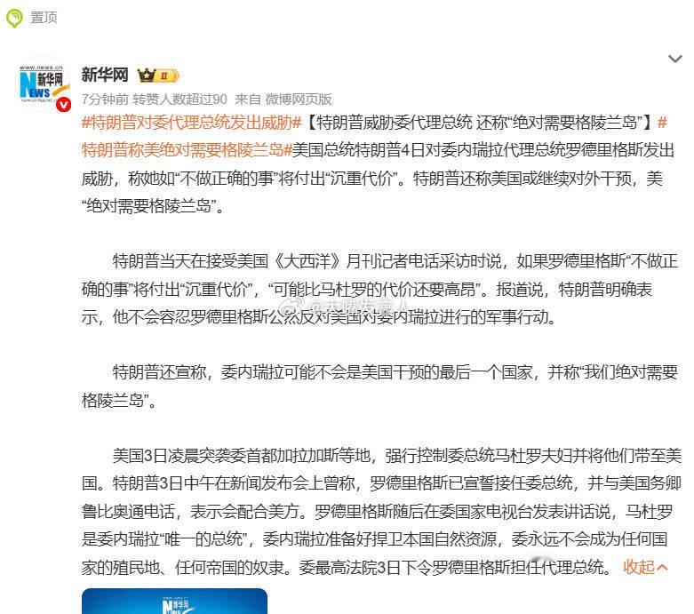 特朗普对委代理总统发出威胁 “和平与发展”还是时代主题吗?我们对外贸易顺差超万亿美元,我们的货船跑遍全球,如果没有对等的保护货船的军力,我们能赚钱,人家阿美能抢呀,谁跟我们做生意、谁跟我们友好,阿美虽然不方便直接抢我们、打我们,但阿美能直接打对方、抢对方,时间长了,不仅跟我们做生意的国家、尤其是欧美,但掂量掂量,就是我们中国自己,我们敢确保银河号货船被美军拦截事件,就绝不重演吗?不敢适当对外用冰、不建域外君事基地,会不会错失机会?特朗普称美绝对需要格陵兰岛,委内瑞拉防长誓言捍卫主权,丹麦称美国无权吞并格陵兰岛,热点观点