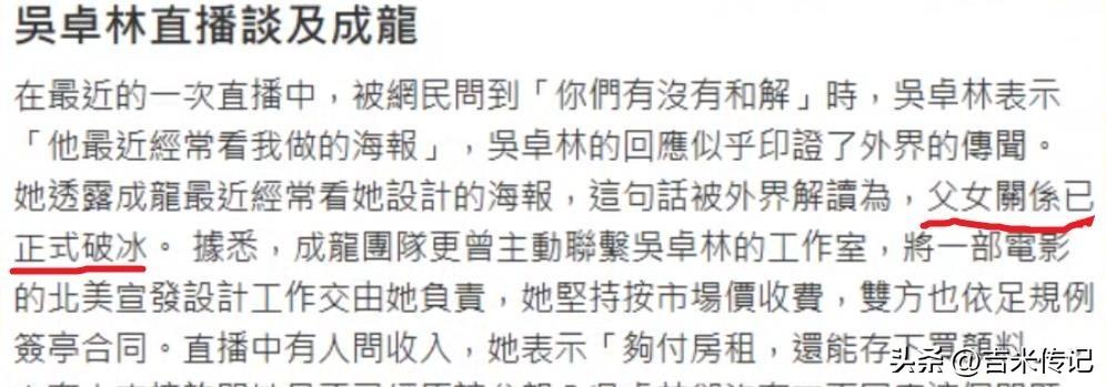 26岁吴卓林获成龙资助?父女冰释前嫌背后竟有这些细节 谁能想到,当年闹得满城风雨的吴卓林,如今竟然靠着一张海报,悄悄打开了和父亲成龙之间那扇紧闭多年的门。说来也巧,这事儿还是从一场直播里漏出来的风声。她坐在镜头前,语气平平,却句句有分量,说是最近接了个设计活儿,对方团队还挺正规,合同也签了,钱也没少给。粉丝一听就炸了,追问到底是谁——原来是成龙的北美宣发项目,找上了她的工作室。 这事要搁几年前,估计没人信。毕竟吴卓林这些年走的路,实在不算顺。19岁离家出走,带着外籍妻子ANDI远走加拿大,母女关系一度崩到差点报警的地步。吴绮莉守着香港那栋空荡荡的大宅,一个人扛了这么多年,网上风言风语不断,说女儿不孝,说娘俩断情绝义。可现在回头看,哪有那么简单?一个孩子从小背负那样的身份压力,成长过程里摔几个跟头,难道不是太正常了? 她在旺角摆摊的事,其实早就有人拍到过。穿着宽松T恤,蹲在地垫前认真给顾客包装手绘衣裳,一坐就是一下午。画风偏日系,带点涂鸦感,价格也不贵,几十块一件。那时候没人知道她是吴卓林,只当是普通年轻艺术生讨生活。谁能想到,这双手后来还能接到国际项目的单子?而且她坚持按市场价收费,不打亲情牌,合同走流程,一分都不多要,也不委屈自己。 成龙那边到底怎么想的,外人自然没法进他们脑子里看。但能主动联系她做设计,还把正经商业项目交出去,显然不是随便试水。更别提她自己说,这笔收入够交房租,还能存点钱买颜料——听着不大起眼,可对一个曾经被贴上“啃母”“靠争议博关注”标签的人来说,已经是巨大的翻身。 她妈吴绮莉最近状态确实不一样了。52岁的人,视频里笑容多了,话也愿意讲了。偶尔拍拍日常,分享点生活感悟,不再像过去那样字字带刺、句句控诉。她说女儿上进,说她靠自己养家,这话要是早几年说,估计很多人摇头不信。但现在看来,她不是在护短,是真看到了变化。 八年来没回过家团聚,母女隔着时差和情绪冷战,如今也算慢慢松动了。曾经的叛逆少女,如今能稳住生活节奏,有工作、有婚姻、有创作能力,哪怕日子不算大富大贵,但脚步踏实了。有些人用二十年才能明白的事,她在跌跌撞撞里,也算走到了。