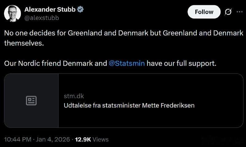 芬兰总统、瑞典首相和挪威首相均表示全力支持邻国,并重申只有丹麦和格陵兰才有权决定与丹麦和格陵兰有关的事项。来源:swedishPM、alexstubb、jonasgahrstore特朗普称已抓获委内瑞拉总统特朗普称将占领管理委内瑞拉美军空袭委内瑞拉首都