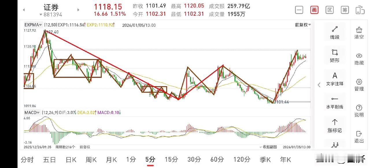 聊聊证券板块(2026.1.5) 在上一篇的文章中讲到,周一会实现开门红,今天的走势可谓是红红火火,证券更像是打了鸡血的往上冲,大盘也重新上到了4000点,尽管如此,本人依然维持原来的观点,短期继续看空,耐心等待买点的出现。 1.从30分钟图一上看,今天的强势上涨虽然诱人,但量价关系并不匹配,诱多的成分很大,况且目前并没有出现买点,在买点没出现的情况下,就是管住手,操作上切莫操之过急。目前判断这里就是一个诱多型的下跌中枢。 2.从5分钟图二上看,这笔5分钟反弹很强,直接升级成为了30分钟一笔,其实这笔反弹的目标应该是回补上方缺口,待回补完成后,仍将会逐步回落,并呈现重心下移的走势,而且从结构上看,目前上涨已经进入尾声,技术上是有回调需求的,所以此处还是继续空仓观望比较稳妥。 总之,继续等待吧!有好的操作机会我也会做出友情提醒。证券板块解析 A股行情讨论