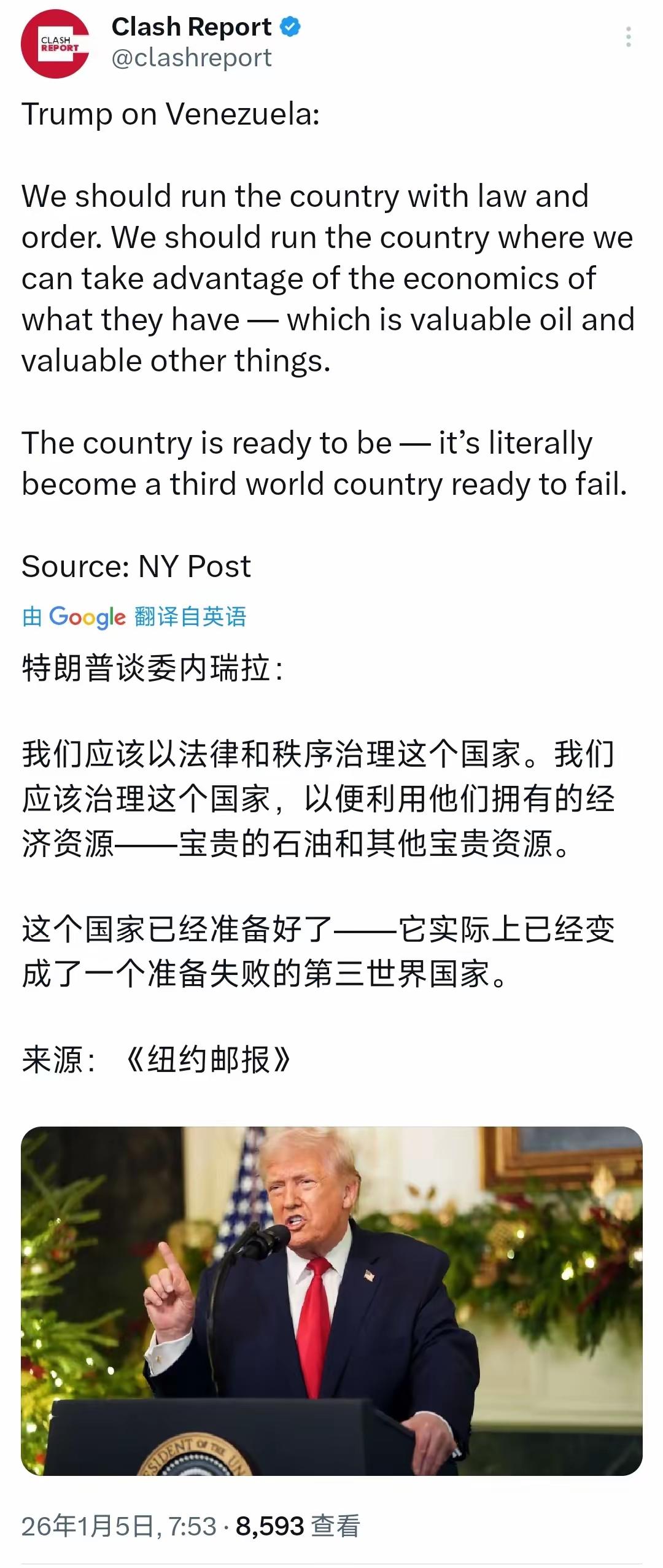 特朗普开了2026年一个大笑话! 特朗普又谈起委内瑞拉说道:“我们应该以法律和秩序治理这个国家。我们应该治理这个国家,以便利用他们的经济资源,宝贵的石油和其它资源…” 美国刚违反国际法对委内瑞拉一个主权国家进行军事行动,现在又说以法律和秩序治理这个国家本来就是个笑话。况且,特朗普是以打击“贩毒”为由对委内瑞拉进行军事行动,然而,据法律专家认为,贩毒和帮派暴力属于刑事犯罪行为,并未达到国际法所承认的武装冲突标准,因而不足以成为发动军事行动的理由。 其实,正如同网友所说:“当特朗普说用法律和秩序治理委内瑞拉时,不如先用这套拯救美国遭“斩杀线”的人民如水火之中再说吧!”,然而,特朗普“醉翁之意不在酒”,真正想占委内瑞拉石油资源才是真。