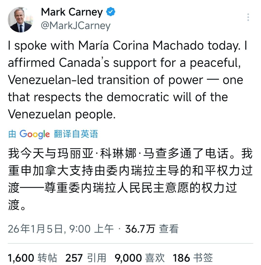 1月5日,加拿大总理卡尼与委内瑞拉反对派领袖、2025年和平奖得主马查多进行了第二次通话,持续约45分钟。有趣的是,卡尼本想“邀功”,没想到特朗普却在同一时间“抛弃”了马查多,不愿让她在委内瑞拉掌权。那么,如何看待加拿大的这个判断失误呢? 首先,这一次通话主要还是围绕美国军事干预后的委内瑞拉形势。马查多介绍了当前委内瑞拉的国内局势,包括反对派内部的分歧和美军的临时接管,她强调需要国际社会支持一个委内瑞拉人主导的临时政府。卡尼表示,加拿大坚定支持马查多的民主努力,并承诺提供人道主义援助和外交协调,帮助推动联合国框架下的多边对话。这次对话体现出了马查多的某种“焦虑”,尤其特朗普没有给她明确的承诺。 其次,从加拿大的角度来看,卡尼进行这次通话的目的,在于巩固加拿大在委内瑞拉危机中的外交影响力。首要目的是支持反对派主导的和平过渡,卡尼早在2025年就加强对马杜罗的制裁,此次通话延续了这一政策。此外,卡尼的目的还包括保护加拿大在委内瑞拉的利益,包括能源投资和侨民安全。总体而言,卡尼的目的体现了加拿大外交的基本方向:强调法治、多边主义和人权,同时避免与美国直接对抗,以维护美加同盟的稳定。 最后,但尴尬的是,卡尼在这次通话中明显误判了形势,过高估计了马查多在美国决策中的影响力,却忽略了特朗普的转向。卡尼的目的本是借助马查多推动和平过渡,但特朗普的“反水”和“抛弃”直接削弱了她的地位,使加拿大显得被动。卡尼的通话强调“委内瑞拉人主导”,却未预见到特朗普会单方面重塑权力格局。 这使得卡尼面临外交尴尬,马查多的弱势让加拿大的支持不仅显得毫无效果,甚至可能引发特朗普的不满。总的来看,这次误判暴露了卡尼团队的情报不足,以及对特朗普不可预测性的严重低估。