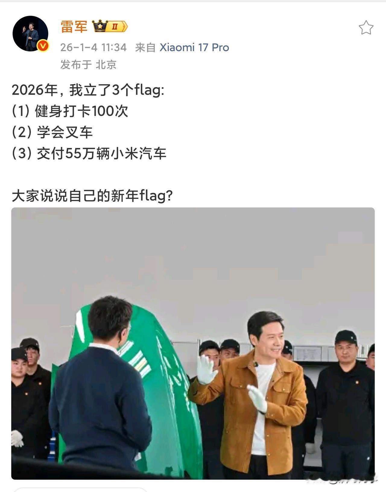 2026年,雷总的新年flag有三个,分别是健身打卡100次、学会叉车、交付55万辆小米汽车。个人分析,在雷总心里健康是摆在首位的,自律的健身本来就是让身体变得越来越好的一种方式,打卡的同时又可以带动网友们的关注,也有很多网友跟着雷总一起打卡健身,起到了品牌宣传的作用;学会叉车是一项生存技能,在汽车工厂开叉车很重要,就看雷总怎样给大家展示学习的成果吧;交付55万辆小米汽车是对小米汽车品牌的自信,2026年会有好几款新车发布,肯定又会引发大量网友的关注,划一划2026年重点词~就是增程。小米YU9是大型增程车,预计会有大电池,综合续航绝对超乎你的想象!那么,2026年大家的flag又是什么呢?我先说,一定要去一趟新疆旅游。雷军小米车 小米雷语 雷军 小米汽车宣传图 小米雷总语录 小米总监 小米超跑梗 小米新战略 深圳小米总