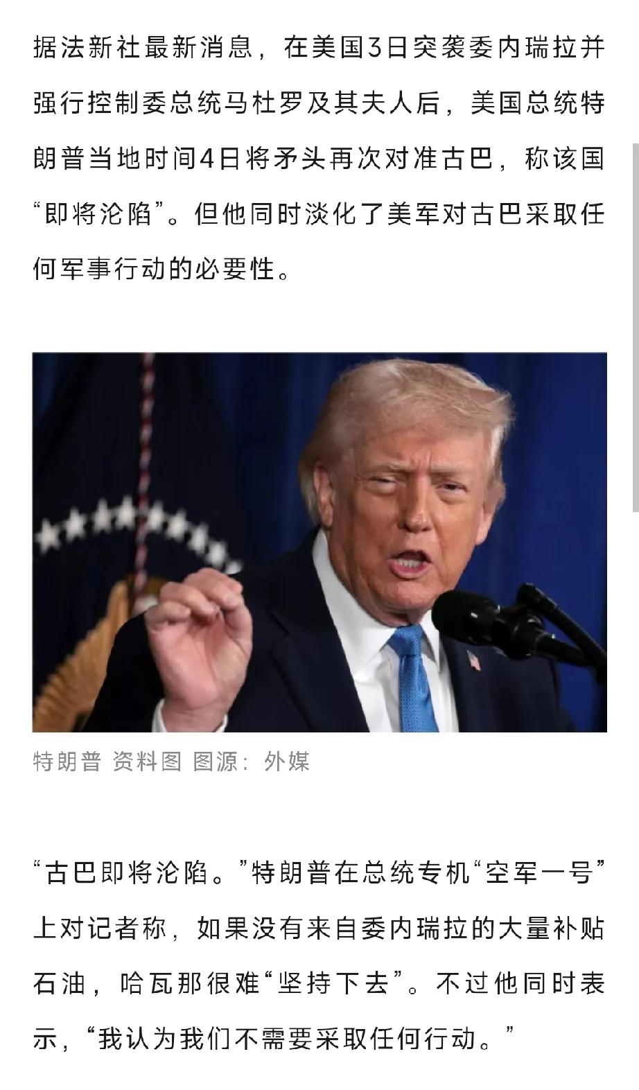 南美国家或面临集体更迭危机…… 从特朗普警告哥伦比亚“你小心点儿”,从特朗普提醒古巴“即将沦陷”,以及特朗普表态就抓获马杜罗一事还可以“再干一次”等举止言行看。 从特朗普本来就是一个说了就做的人看。 美军与情报机构在下一盘更大棋,不会仅限于更迭委内瑞拉,而是要把整个南美沦为自己的殖民地! 事实上,美元美债都迫切需要把南美抢到美国手中。