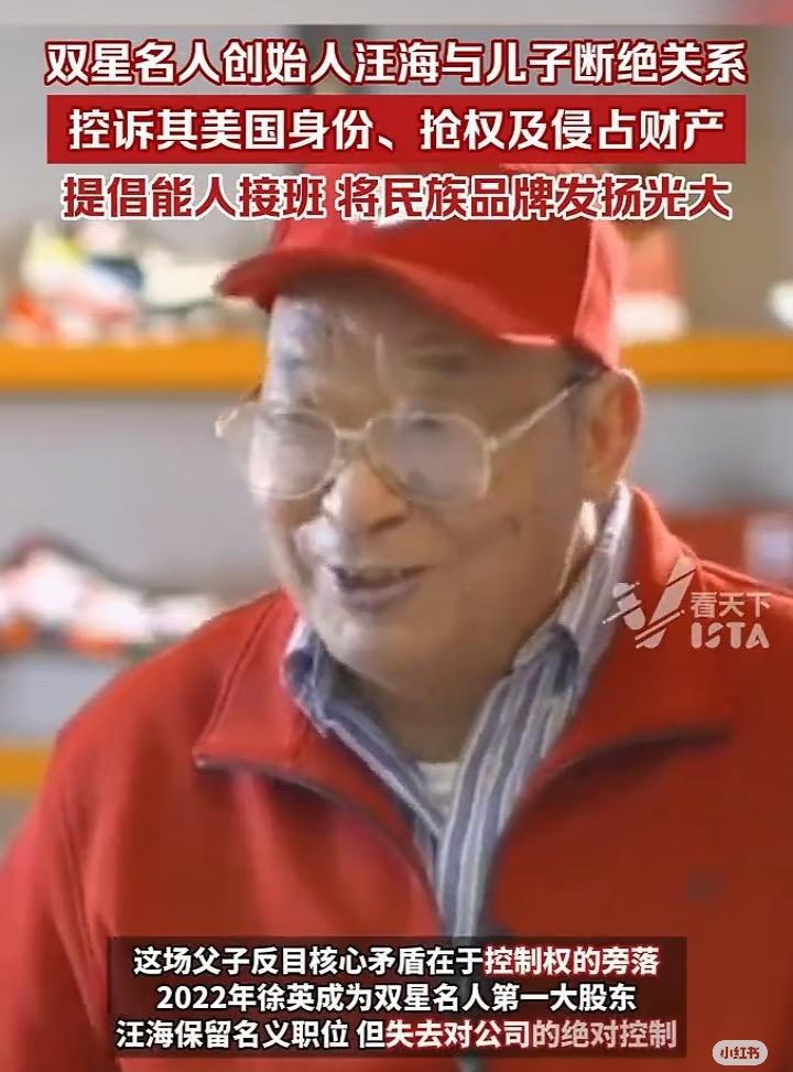 双星名人开年这场父子反目,把百年品牌的接班难题撕得太彻底。 2022年儿媳徐英控股的公司增资成了大股东,汪海名义上挂着职位,实际说了不算,后来儿子儿媳抢公章、逼宫,折腾了快一年,从报纸上吵公章谁有效的事,到现在直接断绝关系。汪老爷子最在意的是接班人国籍,说儿子儿媳都是美国身份,民族品牌不能让外国人接;还说他们不让提自己,拆头像、停用商标,连工资都扣,这哪像一家人? 这哪是普通家庭矛盾?百年品牌的根,能说断就断吗?