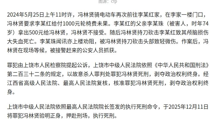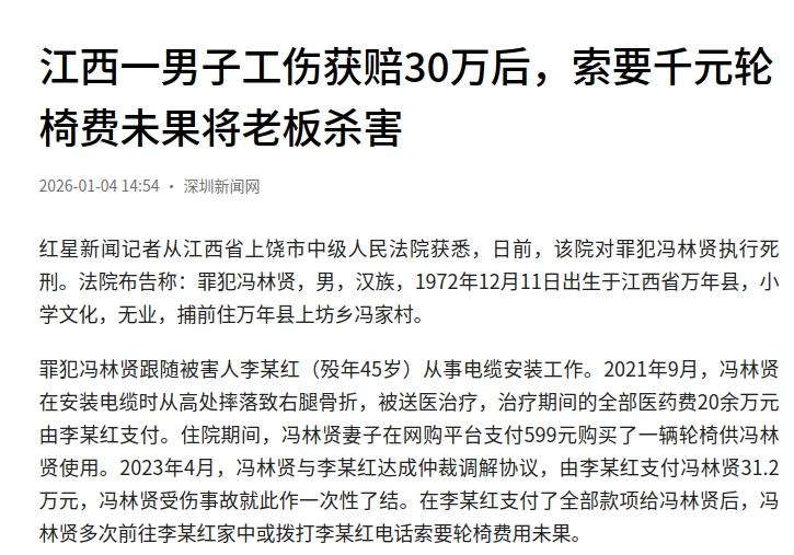 这个新闻从一开始就是在引导舆论,这起事件里面的犯罪人冯林贤,的确是罪有应得;被执行死刑也是公平的判决;但是这类事件背后折射出的当代社会弱势群体下普遍存在的脆弱心理问题和劳务纠纷后续的心理康复和社会再融入才是媒体应该深入探讨的。 心理学上有个“挫折‑攻击”假说,当个体实现目标的努力被阻断,且归因于他人时,容易产生攻击行为。从受伤到最终协商完成,经历将近2年时间,最终老板愿意支付20余万医疗费和31.2万赔偿,却拒绝千元轮椅费,这在冯林贤看来是一种象征性的轻视,加深了“被欺压”的相对剥夺感。 研究显示,相对剥夺感强的人更容易采取极端手段来恢复“公平”。冯林贤将轮椅费视为老板“故意刁难”,进而将长期积累的愤怒集中发泄。 另外就是冯林贤此人的个性可能就比较偏激,认知狭隘;对于他来讲,可能最重要的就是面子,在多次讨要轮椅费无果后,面子,这一仅存的社会资本也被剥夺,最终导致他走上极端,杀人来挽回面子。 这其实也是在警醒我们在社会上遇到这样的人格狭隘、性格偏激;俗称一根筋的人,真的要注意不要惹起矛盾;在你看来微不足道的小事,对于这样的人来说却是天大的事情;甚至连命都不要也要维护;矛盾激化后往往采取极端行动;必须避而远之。