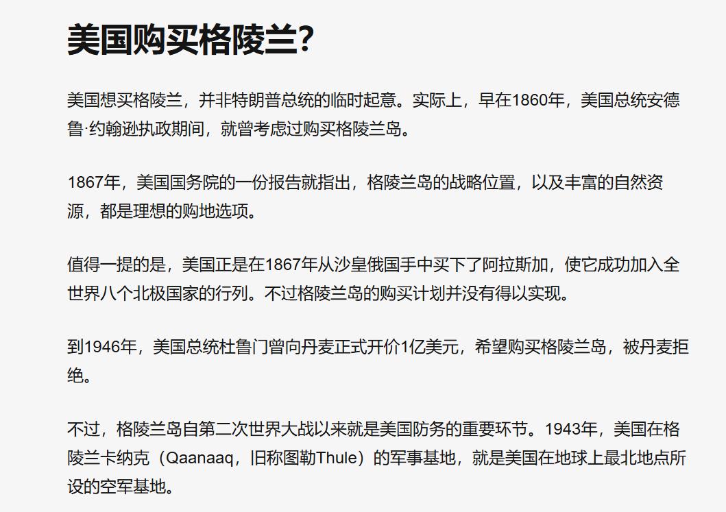 长期以来,格陵兰岛是美国全球战略的重要一环,自第二次世界大战以来,美国就已经在格陵兰岛设立了空军和雷达基地。“格陵兰岛据估计蕴藏有大约3850万吨稀土氧化物,而全世界其他地方的稀土氧化物总量约为1.2亿吨。” 周日,丹麦呼吁美国停止“威胁”格陵兰岛。此前一天,美国总统特朗普告诉美国媒体,他“绝对”需要这片领土,而就在一天前,华盛顿逮捕了委内瑞拉总统。 华盛顿对委内瑞拉的军事干预再次引发了人们对格陵兰岛的担忧,特朗普曾多次明确表示,他希望格陵兰岛成为美国吞并的一部分。 特朗普在接受《大西洋月刊》采访时的言论,以及他最有影响力的助手的妻子在社交媒体上发布的一张格陵兰岛涂成美国国旗颜色的照片,都加剧了这种担忧。 丹麦首相梅特·弗雷德里克森周日晚间发表声明称:“我必须非常明确地告诉美国:美国应该控制格陵兰岛的说法绝对是荒谬的。” 她呼吁华盛顿停止“威胁其历史盟友”。 周六,特朗普派遣军队袭击委内瑞拉首都加拉加斯,逮捕了委内瑞拉总统尼古拉斯·马杜罗,目前马杜罗被关押在纽约。此举令美国的欧洲盟友感到不安。 特朗普曾表示,美国将无限期地“控制”委内瑞拉,并开采其巨大的石油储备。 就格陵兰岛而言,特朗普声称,鉴于其位于北极的战略位置,将这块丹麦领土并入美国符合美国的国家安全利益。 格陵兰岛还蕴藏着高科技行业所需的关键矿产资源。 据《大西洋月刊》周日报道,在接受该杂志电话采访时,当被问及委内瑞拉军事行动对格陵兰岛的影响时,特朗普表示,这应由其他人来决定。 “他们得自己考虑。我真的不知道,”特朗普说道。 他补充道:“但我们绝对需要格陵兰岛。我们需要它来进行防御。” 周六晚些时候,特朗普副幕僚长斯蒂芬·米勒的妻子凯蒂·米勒在她的X账号上发布了一张颇具争议的图片,图片中丹麦自治领土被涂成了美国国旗的颜色。 她的帖子上方只有一个词:“很快”。 格陵兰首相延斯-弗雷德里克·尼尔森称该帖子“不尊重人”。 他在X上表示:“国家和人民之间的关系建立在相互尊重和国际法之上,而不是建立在无视我们地位和权利的象征性姿态之上。” 但他同时表示,“既没有理由恐慌,也没有理由担忧。我们的国家不是用来出售的,我们的未来也不是由社交媒体上的帖子决定的。” 丹麦驻美国大使杰斯珀·默勒·索伦森周日早些时候也发表了自己的声明,称“我们希望丹麦的领土完整得到充分尊重”,并附上了凯蒂·米勒图片的链接。 丹麦政府为实现这一目标而采取的举措——包括任命驻丹麦领土大使——激怒了哥本哈根和欧盟。 斯蒂芬·米勒被广泛认为是特朗普诸多政策的幕后推手,指导总统推行强硬的移民政策和国内议程。 丹麦大使针对凯蒂·米勒的帖子做出了意味深长的“友好提醒”,指出丹麦——北约成员国——已“大幅加强北极安全工作”,并与美国就此展开合作。 索伦森写道:“我们是紧密的盟友,应该继续保持这种合作关系。” 凯蒂·米勒在特朗普第一任期内担任国土安全部副新闻秘书。 之后,她曾担任时任副总统迈克·彭斯的通讯主任,并兼任其新闻秘书。