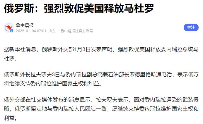 1月3日-4日,马杜罗出事后,俄罗斯连续做了3件事,并强烈敦促美国释放马杜罗。日本媒体认为:美国在委内瑞拉的行动,可能恶化美俄关系。 马杜罗出事之后,俄罗斯外交部第一时间发表声明,明确证实马杜罗夫妇身处美国,强烈敦促美国领导人重新考虑立场,释放这位合法选举产生的主权国家总统及其夫人,强调必须通过对话解决美委之间的分歧。 在首次声明后不久,俄外交部再次发声,进一步强化立场,坚决呼吁美方立即释放马杜罗夫妇,并要求美国尽快澄清马杜罗的相关情况,用连续的外交表态施压美国。 俄外长拉夫罗夫还主动与白俄罗斯外长通电话,双方达成共识,一致强烈谴责美国对委内瑞拉的侵略行为,共同要求释放马杜罗夫妇,还强调要创造符合国际法的对话条件解决委内瑞拉问题,形成国际协作施压的态势。 俄罗斯这一连串动作,显然是在明确表达对美国单边行动的反对。而更让特朗普头疼的是,美国的这次行动,还意外给了俄罗斯在俄乌停火问题上的“主动权”。 此前,美俄总统曾多次通话讨论俄乌冲突问题,特朗普还曾表示希望尽快结束冲突。但如今美国在委内瑞拉动武,俄罗斯完全可以以此为借口,拒绝推进俄乌停火进程,甚至将俄乌冲突拖延的责任甩给美国——毕竟美国率先在国际上使用武力破坏国际秩序,俄罗斯完全有理由认为,在这样的背景下推进停火,无法保障自身及相关方的合法权益。 特朗普政府本想通过打击委内瑞拉彰显自身强硬形象,巩固国内票仓应对中期选举,同时掠夺一些资源缓解经济压力。但俄罗斯现在的强势反击让美国在国际上陷入孤立,不少国家都谴责美国的霸权行径。 另一方面,俄乌冲突若因这次事件持续升级,不仅会让特朗普此前推动停火的努力付诸东流,还可能引发更多国际争议,影响其在国际事务中的战略布局。 美俄关系的进一步恶化,也会让双方在能源、安全等多个领域的博弈加剧,后续美国的国际政策推进大概率会遭遇更多阻力。 目前,马杜罗已被送至美国纽约的拘留中心,委内瑞拉最高法院已下令副总统担任代理总统维持国家运转,国际社会对美国的谴责仍在持续,俄罗斯也未放松施压。 这场因马杜罗被扣押引发的国际风波还在发酵,而它对美俄关系、俄乌冲突走向以及特朗普政治布局的影响,才刚刚开始显现,不妨“让子弹飞一会”。
