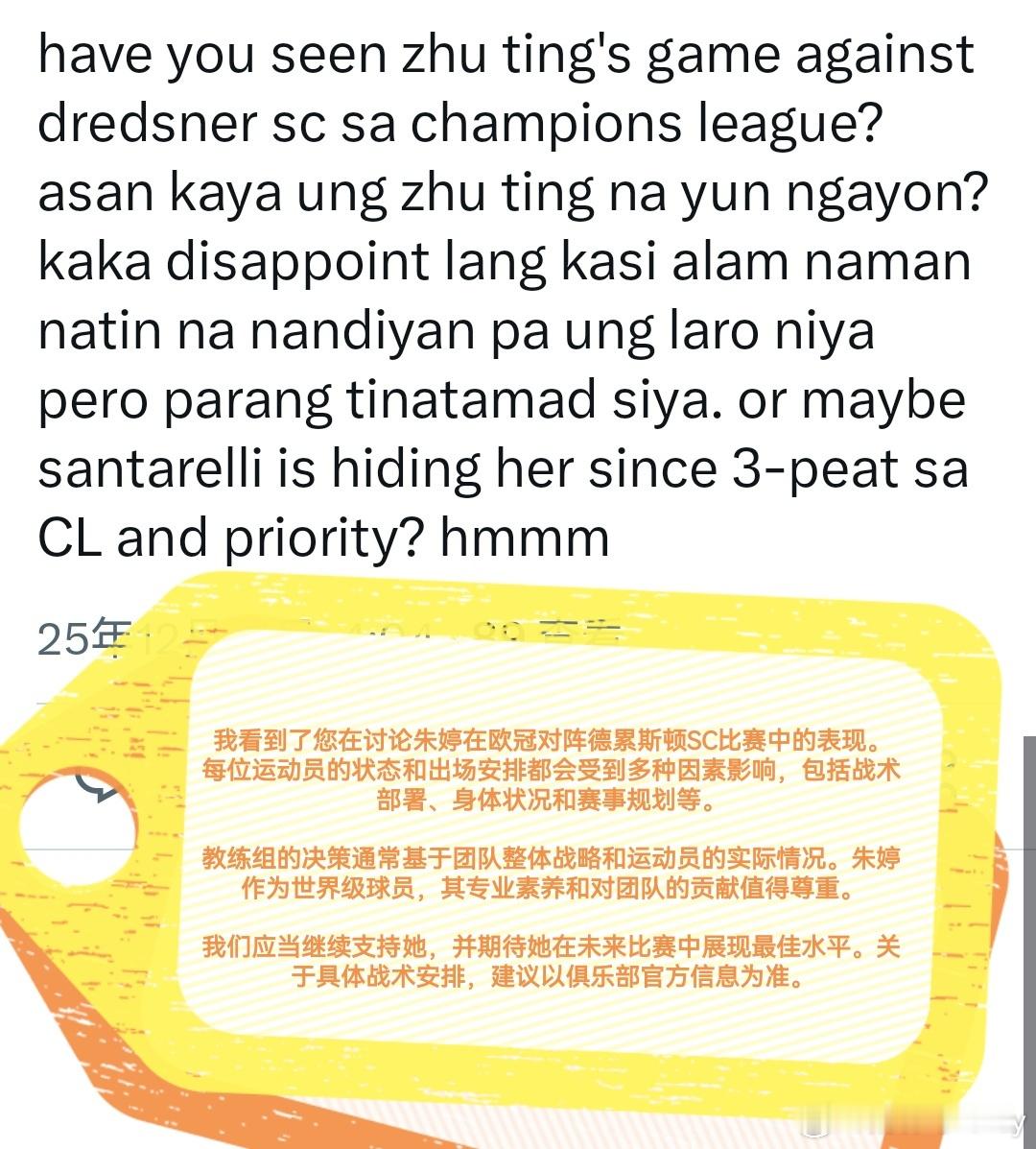 【致传奇:巅峰会过去,但传奇永存】看了这位来自美国纽约的博主系列评论,心里满是感慨。的确,任何一名运动员的职业生涯都是有周期,强如朱婷,也会从“巅峰期的世界第一主攻”步入新的阶段。但正如那些截图里所言:“任何生涯后期的下滑,都抹杀不了她们已取得的成就。”21岁,里约奥运MVP➕最佳主攻➕金牌;近乎零失误的效率之王;带领球队创造历史的领袖……这些片段拼凑出的,是一个时代。她或许不再每个球都雷霆万钧,但那份在逆境中稳住局面、在关键分上一锤定音的大心脏,早已刻进排球的记忆里。所以倒数第二张截图说的,没有见证过朱婷巅峰期叱咤风云,就会误认为上帝创造了马尔科娃其实我们不必遗憾“再也看不到那个朱婷”,而该庆幸我们见证过她的黄金时代。真正的伟大,从不因时间褪色——控制大过混乱,传奇高于起伏。此刻,无论她选择在赛场坚守还是转身,都值得一句:谢谢你,曾经照亮过那片球场。我只想说掌上明朱 一路婷你 。传奇不止于巅峰朱婷