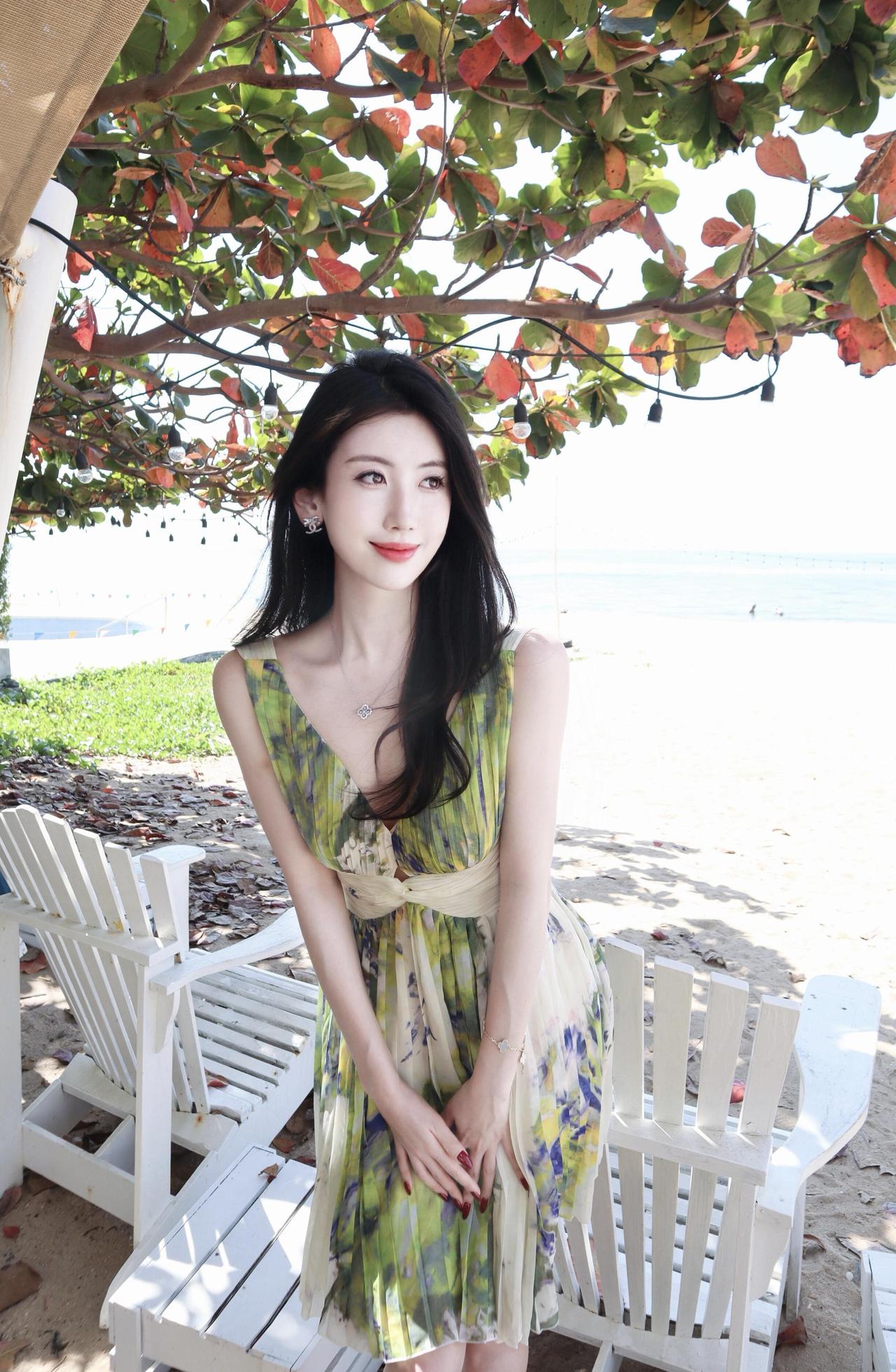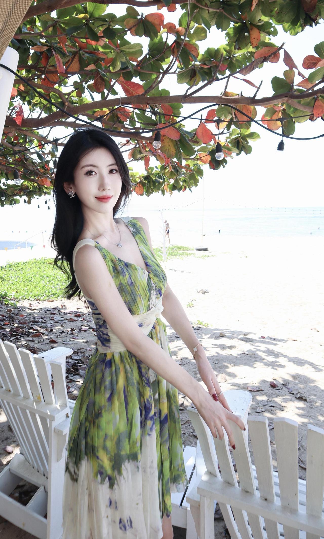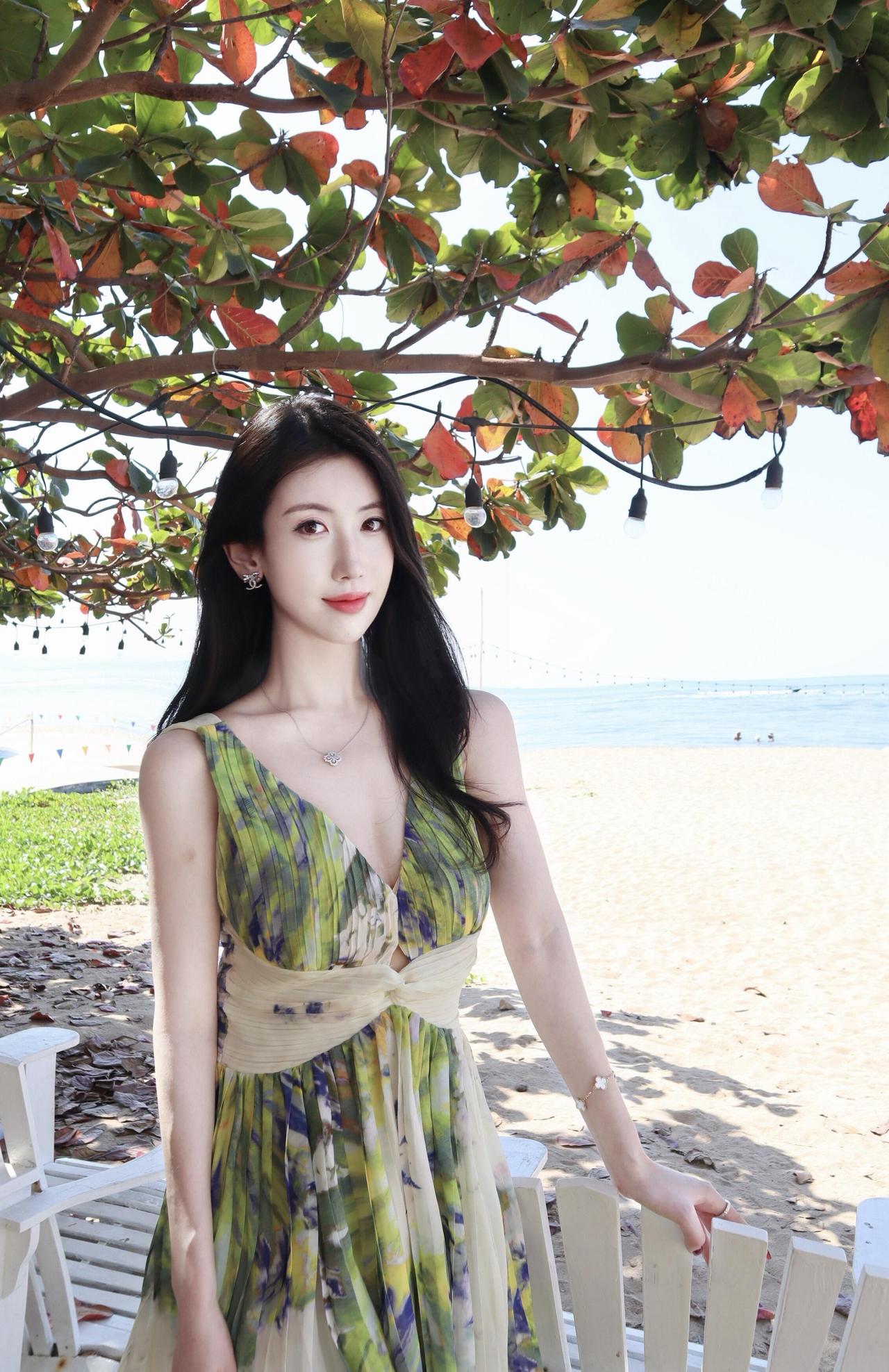 望海潮·海畔晴光 作者Ⅰ朱珠 海沙铺软,晴光漫洒,枝头叶染丹霞。青蔓垂荫,白椅横陈,裙裾漾作春纱。绿紫晕繁花,素绫束纤腰,风拂鬓斜。手抚栏干,笑眸轻盼,望天涯。 又攀秋千金链,任潮声拍岸,影逐波斜。裙袂飘飖,云鬟微乱,恍如蝶落晴沙。碧海映明霞,远岸浮鸥鹭,自在横斜。漫倚绳链凝眸,心事付烟霞。 忆那林阴初立处,树影筛金覆浅沙。裙纹叠作溪头浪,花色凝如陌上霞。白椅闲撑云一角,纤手轻扶木几斜。海风偷拂裙边带,偷把幽香送远涯。 及至秋千摇影时,金链叮当响落霞。青丝漫卷风前絮,笑靥轻开锦上花。碧海平铺千顷玉,晴光乱洒万重纱。滩头偶见人闲坐,浪软风柔意自遐。那裙间绿似汀洲草,裙底蓝如海上槎。不必簪花添秀色,天然风致胜桃花。 潮来潮去皆闲事,云卷云舒只恋霞。手捻链环轻借力,身随秋千荡碧纱。眸中盛得沧溟色,鬓畔粘来浅夏华。此际人间多胜景,海隅风日最清嘉。
