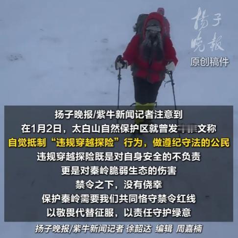 零下二三十度的秦岭风雪里,4 名驴友的失联,只让人觉得怒其不争。明晃晃的禁令当耳旁风,最冷时节轻装闯 “夺命线”,这般拿生命赌刺激的行为,真不值半分同情。 2026 年 1 月 1 日晚 10 点,5 名网上相识的驴友,在领队带领下偷偷踏入小鳌太线 —— 这条隶属于鳌太核心区、2018 年就被全面封禁的非法路线。他们抱着一日速穿 40 公里的侥幸,全程轻装出发,没带帐篷睡袋,食物和保暖物资严重短缺。 1 月 2 日下午还在鳌山沙发石停留,3 日就有 1 人因体力不支、耐不住严寒被迫下山报警。剩下 4 人执意前行,很快在无信号的冰雪无人区失联。直到 5 日,才在采药人窝棚找到 1 人,双脚已冻伤,其余 3 人仍杳无音讯,多部门正冒雪搜救。 要知道,小鳌太海拔超 3400 米,冬季极端低温能冻僵四肢,历史上已有数十人在此殒命。禁令不是摆设,是前人用生命写的警示。 拿自己性命冒险,还消耗公共救援资源,这样的 “探险”,从来都是自私的闹剧,从来都不值得同情!