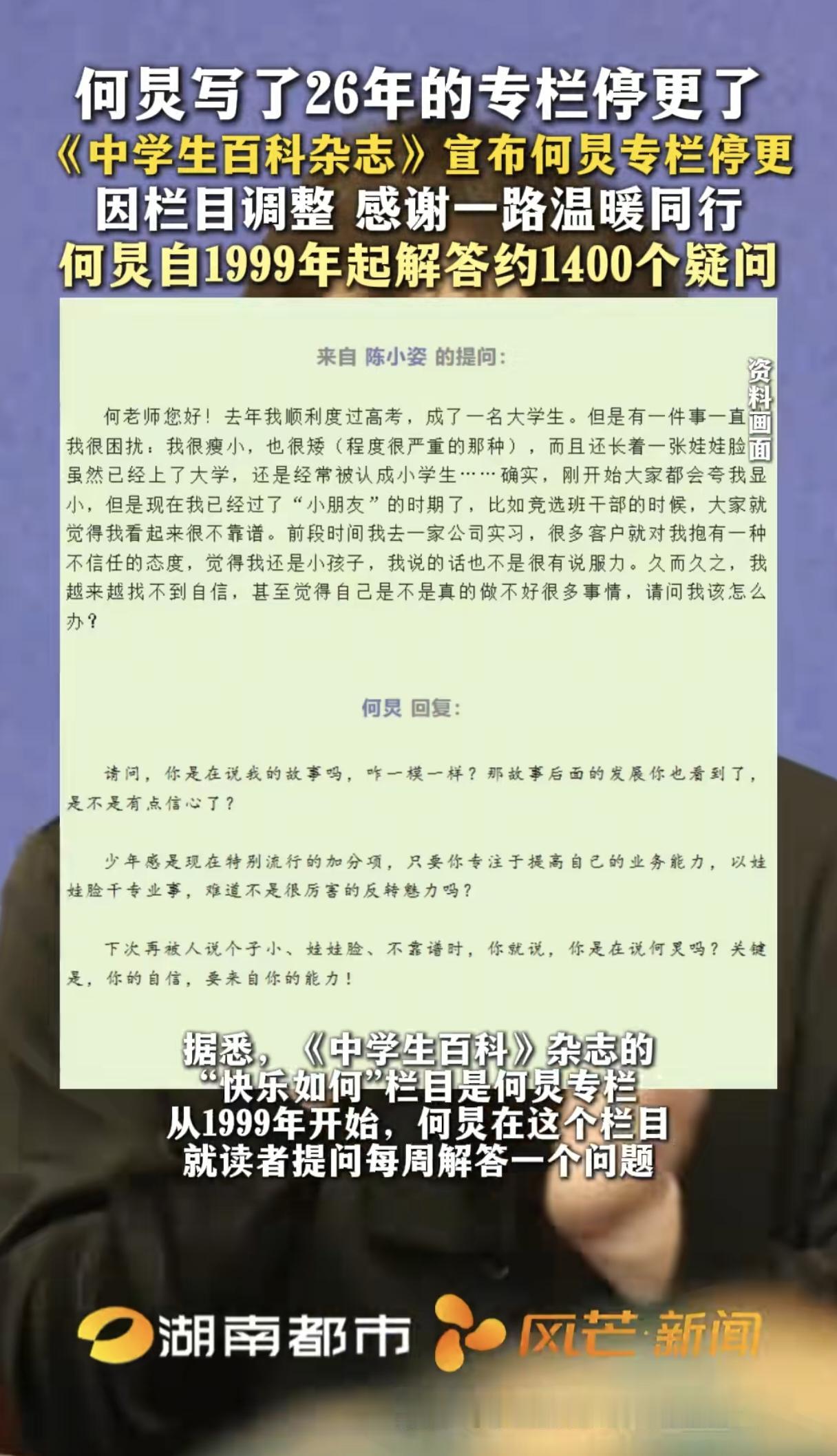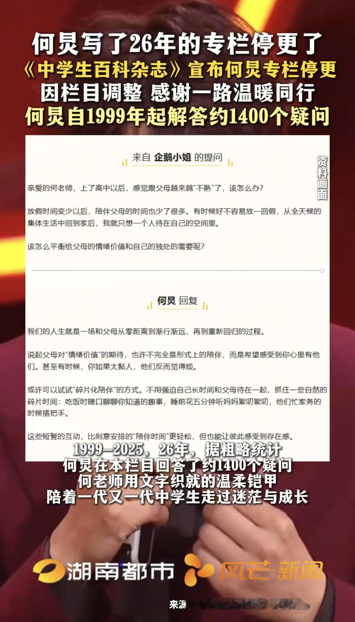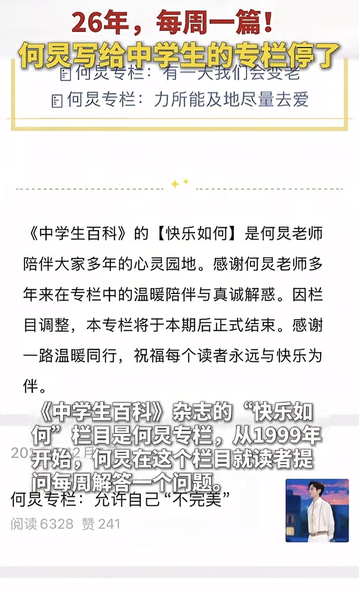何炅写了26年的专栏停更了,有一期问答是这样的:学生讲述,因为身高外貌而自卑,何炅神回复:你是在说我的故事吗?咋一模一样? 这名学生已经顺利进入了大学,但是身材矮小,又长了娃娃脸,大家都觉得她像小孩子,对她缺乏信任。 慢慢的这位学生也变得自卑起来,不知道该怎么办? 何炅回复:请问,你是在说我的故事吗?咋一模一样?那故事后面的发展你也看到了, 是不是有点信心了? 并告诉学生要注重自己的业务能力,以娃娃脸干专业事,是更厉害的反转。 这样的故事还有很多,不得不说,何炅的解答,专业有力而亲切,他的言语常常能带给读者自信和温暖的力量。 1月4日报道,“中学生百科杂志”公众号宣布,何炅专栏停止更新:感谢何炅老师多年来在专栏中的温暖陪伴与真诚解惑。 何炅自1999年起,就读者提问,每周解答一个问题,那时候的他才25岁。 后来虽然越来越红,档期也越来越满,但仍然坚持,迄今为止,解答约1400个疑问。 突然宣布停更了,读者也表示惋惜:偶尔情绪奔溃也会来这里求安慰,怎么就停了? 还有很多网友表示:停了才知道还有这回事。 好可惜啊,虽然不想何老师那么忙碌,但却想在这里看到他。 时光易逝,岁月如梭,青春悄然离去,能坚持26年已经很难得了,感谢他送出去的暖心解答,“何老师”这个称呼真的太配他了!