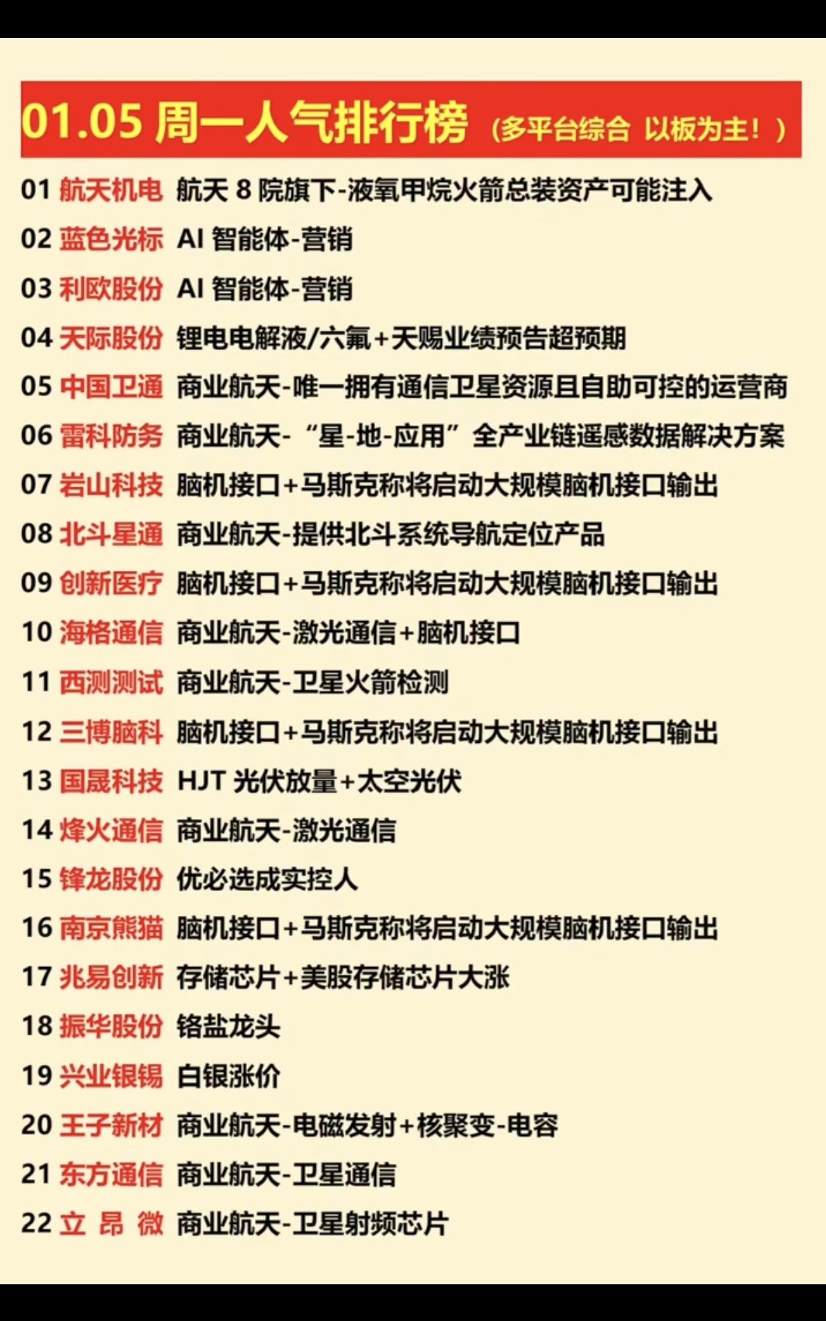 1.5周一 涨停板股票:人气龙虎榜! 1.智能体ai 2.电解液,六氟磷酸锂 3.脑机接口 4.商业航天 5.机器人 6.白银,贵金属