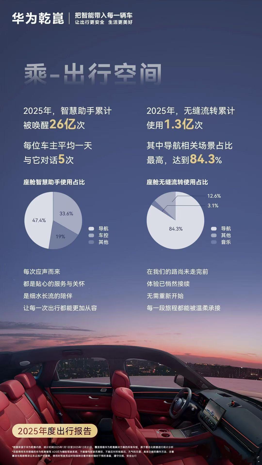 华为乾崑年度答卷来了,真的太强大了!!2025年,华为乾崑智驾的年度出行报告来了!全年辅助驾驶里程超54.2亿公里,相当于绕地球13.5万圈;累计主动避免可能的碰撞超379万次,平均为每位车主避开约1.6次危险;辅助泊车使用超3.3亿次,车位到车位功能也已覆盖超100万个停车场。每一项数据背后,都是千万次出行的安心与信任。从“尝鲜”到“信赖”,用户正在用里程投票:2025年,华为乾崑智驾辅助驾驶活跃用户超130万人,占比超98%。这不仅是技术的普及,更是安全与体验的双重验证。当行业回归本质,华为乾崑用扎实的数据证明:安全,才是汽车智能化最可靠的通行证。华为乾崑年度答卷