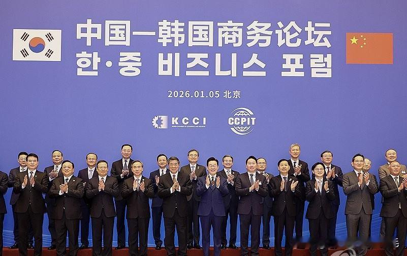 1月5日,借韩国总统李在明访华之机,中韩商务论坛在北京钓鱼台国宾馆举办,这是自2017年12月以来时隔八年的两国企业家盛会。 韩国四大财团掌门三星李在镕、SK崔泰源、现代汽车郑义宣、LG具光谟悉数到场,浦项制铁、CJ等企业负责人及SM娱乐、Krafton等文化游戏领域代表同台亮相;中方包括中石化、宁德时代、腾讯、TCL等企业负责人齐聚,两国逾600人参会。 李在明总统现场见到李在镕时亲切问候,郑义宣则直言盼中韩关系改善助力现代汽车在华产销回升。我方强调中韩“密不可分”,呼吁深化交流合作、推动双边经贸提质升级。崔泰源会长则以“求同存异”寄语,期待两国企业跨越分歧,携手探寻增长新路径。