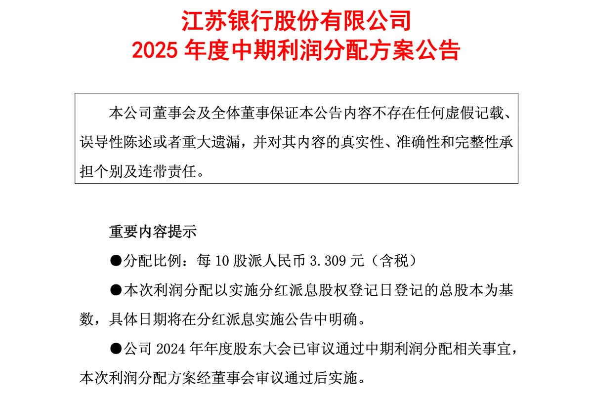 1月4日,江苏银行(600919.SH)发布公告称,拟每10股派3.309元,以总股本18,351,324,463股计算,合计分配60.72亿元(含税),占2025年半年度归母净利润的30%。