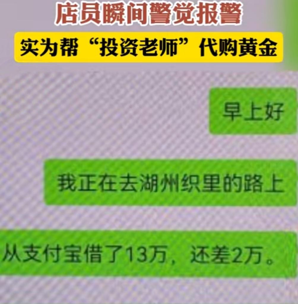 男子网贷15万买金条,借口送老婆放床底,店员一眼识破骗局。 浙江湖州的李先生最近差点栽大跟头!他跑到金店,急着要买15万元的金条,还说要送给老婆放床底,这奇怪的理由直接让店员起了疑心,悄悄报了警。 民警赶到后一查,真相让人哭笑不得。 李先生哪里是给老婆买金条,原来是被网上的“投资老师”忽悠了!对方说让他代购黄金,还承诺垫资购买邮寄后,不仅返还本金,还承诺给他一笔可观的佣金。 被“高额回报”冲昏头的李先生,当场从支付宝借了13万,还差2万也要凑,一心觉得这买卖“稳赚不赔”。就算民警现场戳穿这是骗局,他还死活不信,反复强调自己不会被骗。 没办法,民警只能把他带回派出所,用真实案例做反诈教育。李先生这才终于醒悟,连连感谢警方及时拦住了他,不然15万网贷就要打水漂了。 这事儿也提醒大家,所谓“高额回报”的投资套路,十有八九是骗局,千万别被贪念冲昏头脑!黄金骗局 网购黄金骗局 网购黄金 购买金条 黄金 金子 代购黄金 代购