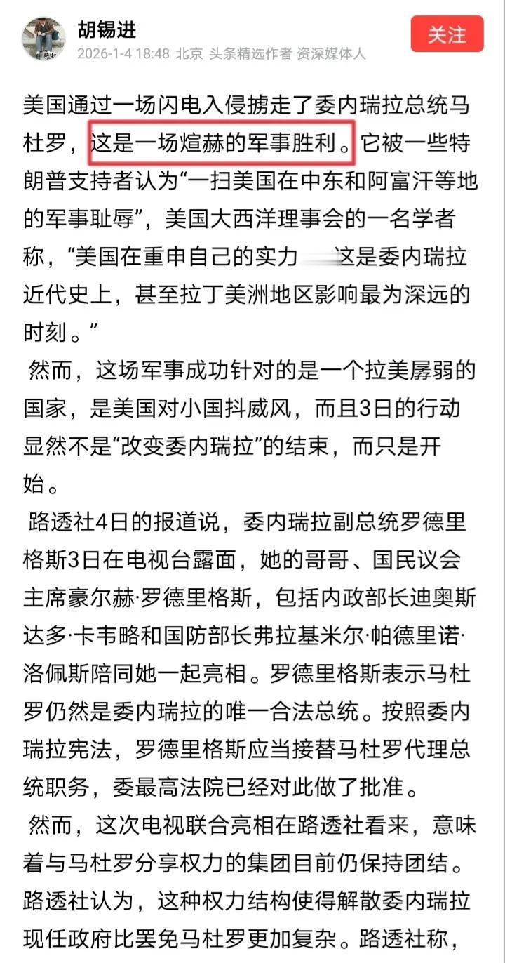 胡锡进竟然叫嚣“中国不需要国际法”,老胡声称“用实力伺候就够了”,这是怎么回事呢? 原来这几天胡锡进兴高采烈,因为美国不费什么功夫就绑架了马杜罗,这时老胡把不干涉他国内政的国际法都抛到了脑后。 可是我们怎么能不需要国际法呢?须知国际法的开罗宣言和波茨坦公告规定了日本领土仅限于四大岛,如果不讲国际法,日本就能非法窃据琉球等岛屿。 胡锡进说什么“中国不需要国际法”,那么日本就不是“非法”窃据琉球喽?