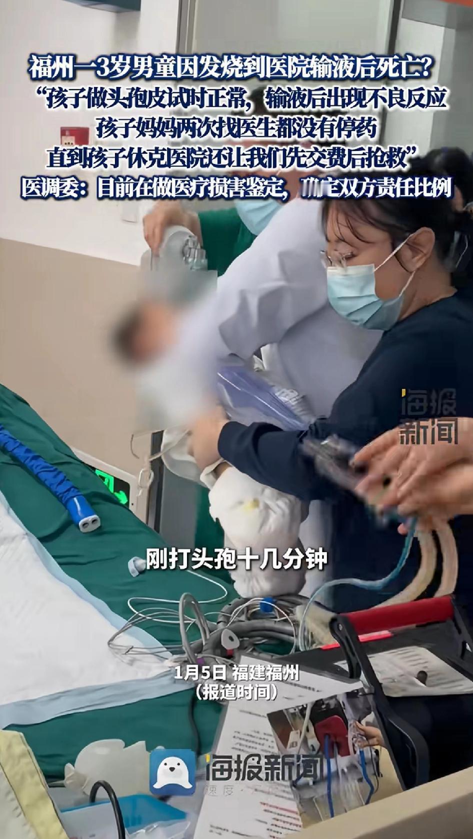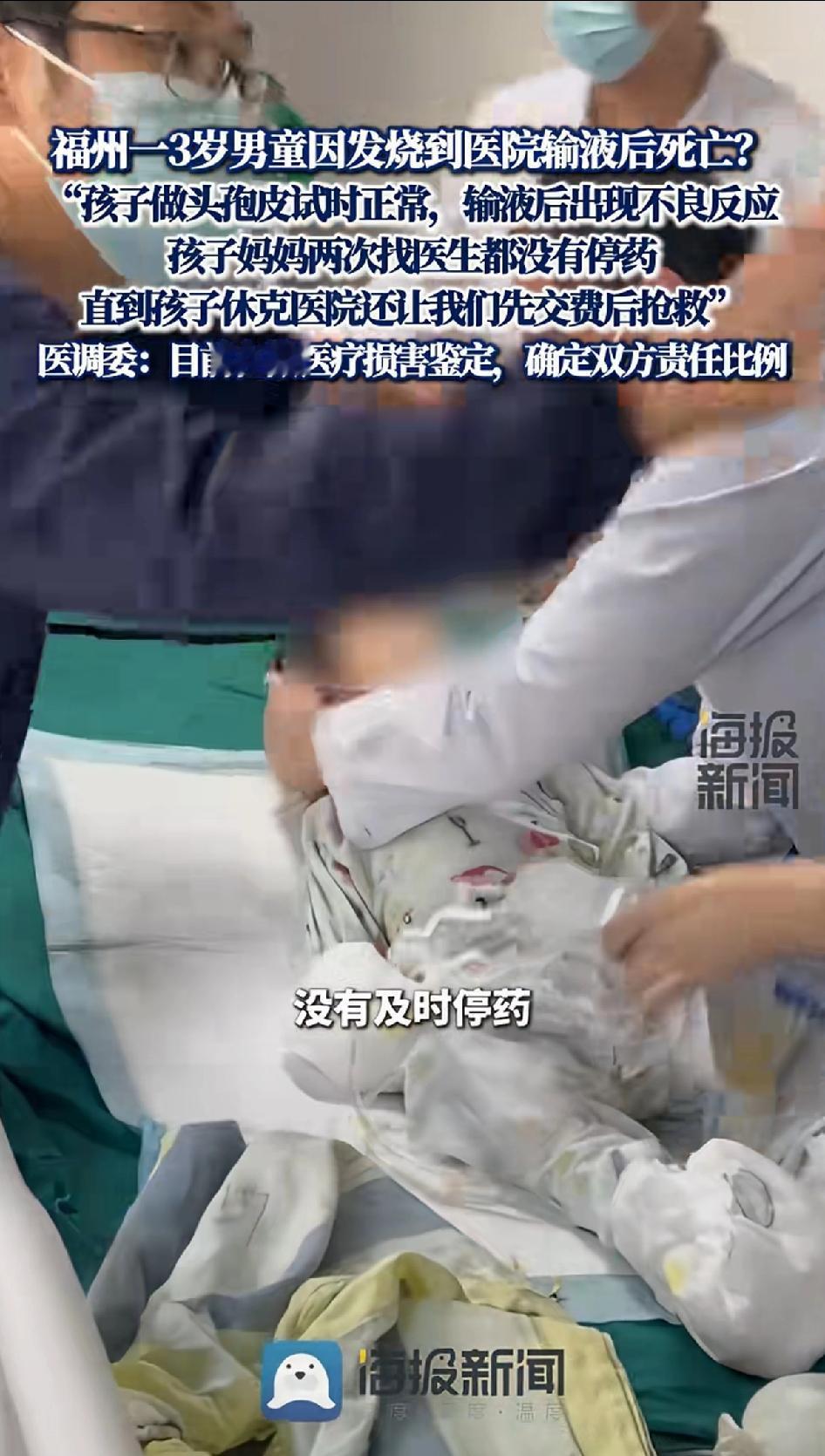 福州一三岁男童发烧到医院输液后死亡?孩子做头孢皮试时正常,输液十几分钟后出现不良反应,孩子妈妈两次找医生,都没有停药。 根据孩子爸爸描述:直到孩子休克医院还让家长先去交费再实行抢救。 医调委:目前在做医疗损害鉴定,确认双方责任比例再划分责任。 如果真是药物过敏导致男童死亡,那医生就要负主要责任。 记得前年肺炎去输液,当时医生问我有什么药物过敏,我说目前没有,那个男医生还是很谨慎,输水时看到我胳膊上起了个红色的包,立马问我怎么回事?什么时候长的包? 我回答刚长的,没任何感觉,医生不放心又打了一针抗过敏药,我当时还觉得有点大惊小怪了吧!现在回想起来还是医生谨慎。 此次事件,如果真是如孩子爸爸描述的那样,孩子妈发现不对劲两次去找医生,都没停药,那确实是疏忽大意了。 一次发烧就断送一条鲜活的生命,这事搁谁身上谁都受不了。 现在医院也只认钱,孩子都休克了,还要先交钱再抢救!医护人员这种做法,根本不把生命放在第一位,是把钱放在第一位。 现在的医护关系紧张,导致医生冷漠,患者不信任医生,医疗事故频繁发生。 期待有关部门尽快出鉴定结果。孰是孰非还当事人一个公道。