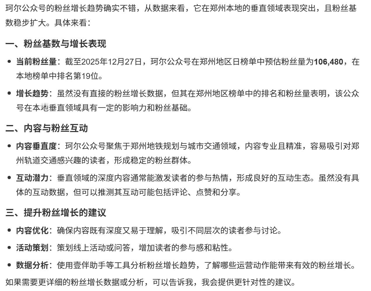 现在的AI真是无所不能啊! 大数据算法太厉害了,今天试着问了一下AI,没想到粉丝的数量和郑州地区的排位都能给出来。感谢各位的支持,才让珂尔坚持走到现在,大家的鼓励,珂尔的动力!感谢家人们的陪伴和鼓励,新的一年,将继续与家人们一路同行,分享郑州乃至河南重点区域的规划和城建资讯!