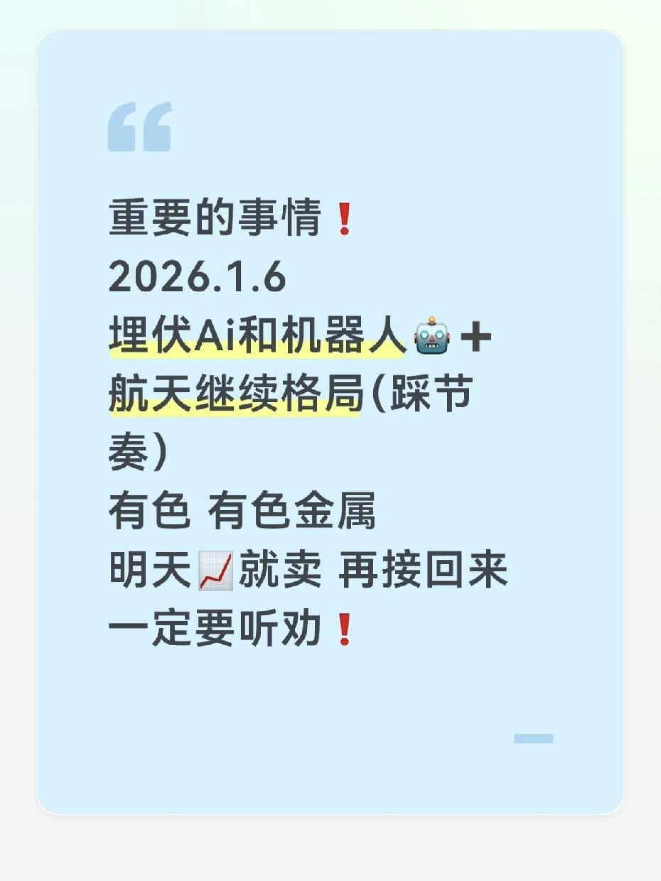 2026.1.6布局思路:AI/机器人蹲风口,有色先做“短差” 今天重点说两个方向,一个蹲长期,一个做短线,节奏踩对了才稳: 先聊AI+机器人:闭眼蹲的长期风口 特斯拉Optimus Gen3刚敲定7家中国核心供应商(三花、拓普、五洲新春都在列),2026Q1就要量产,年底产能冲10万台——这可不是“画饼”,是已经落地的供应链。 AI这边更不用多说,GPT-5的多模态能力肉眼可见地渗透到各行各业,算力、数据、应用端的需求都在涨。 这俩赛道属于“产业趋势明确+政策支持+订单落地”的三好学生,现在布局就是蹲“量产+业绩兑现”的红利,不用急着卖,拿住等风来就行。 再讲有色金属:明天先卖后接,做短差更灵活 最近有色涨得有点猛,主要是美联储降息预期带起来的,但短期涨太快容易回调。 建议明天先止盈一部分:一来锁住当前的利润,二来等回调后再接回——有色的长期逻辑(新能源+机器人用的铜/铝/稀土)没破,只是短期涨多了需要消化,低吸比追高安全。 最后提醒:节奏比方向更重要 AI和机器人是“长坡厚雪”,适合用闲钱慢慢布局;有色是“短期波动大”,适合做波段降成本。 别把长期和短线搞反了:要是拿着有色死扛波动,或者急着卖AI/机器人的筹码,反而容易踏空或被套。 你们手里的AI/机器人仓位现在有多少?