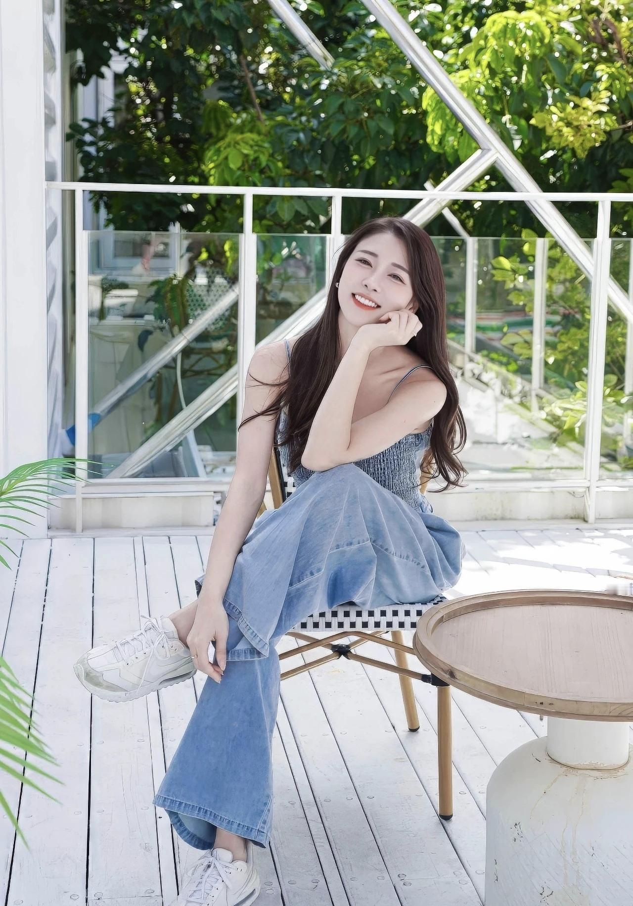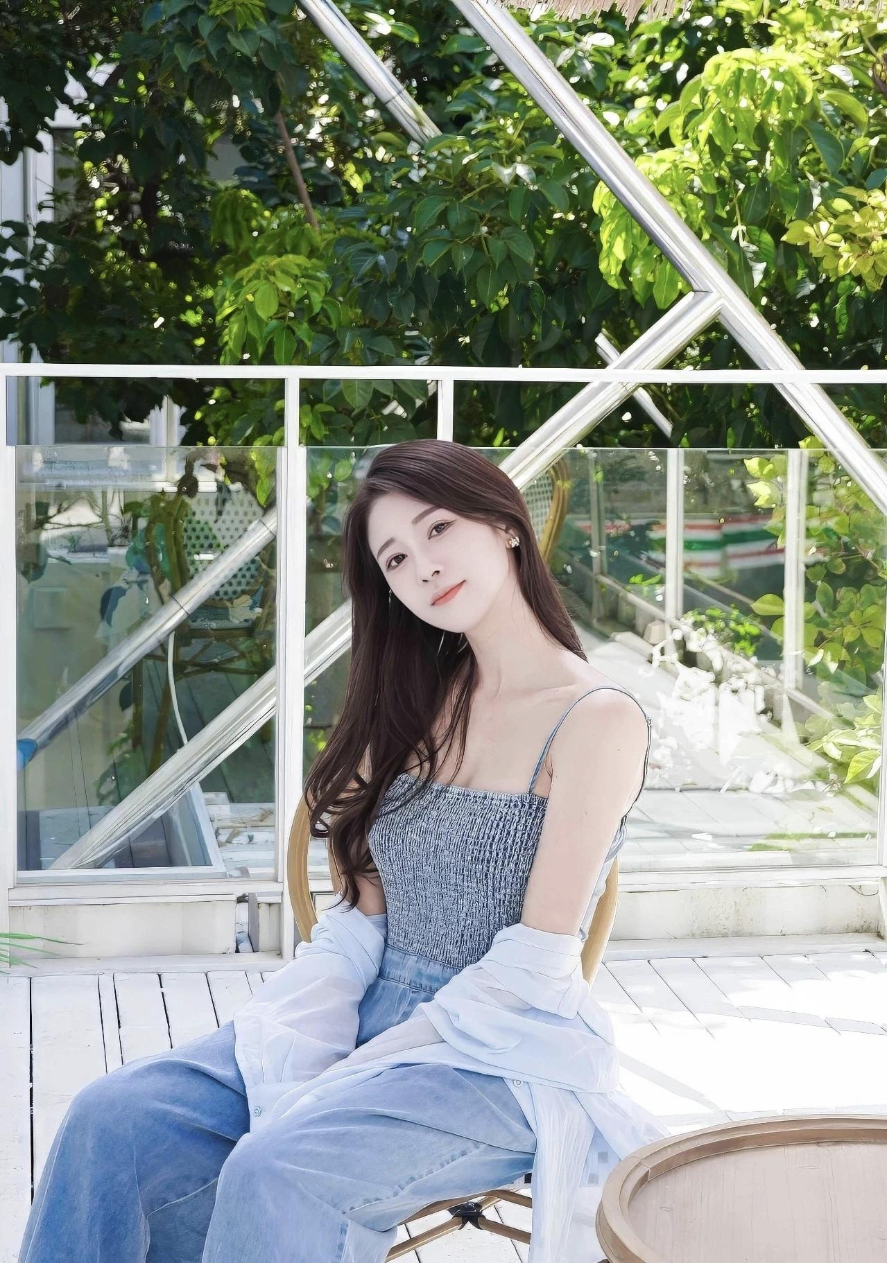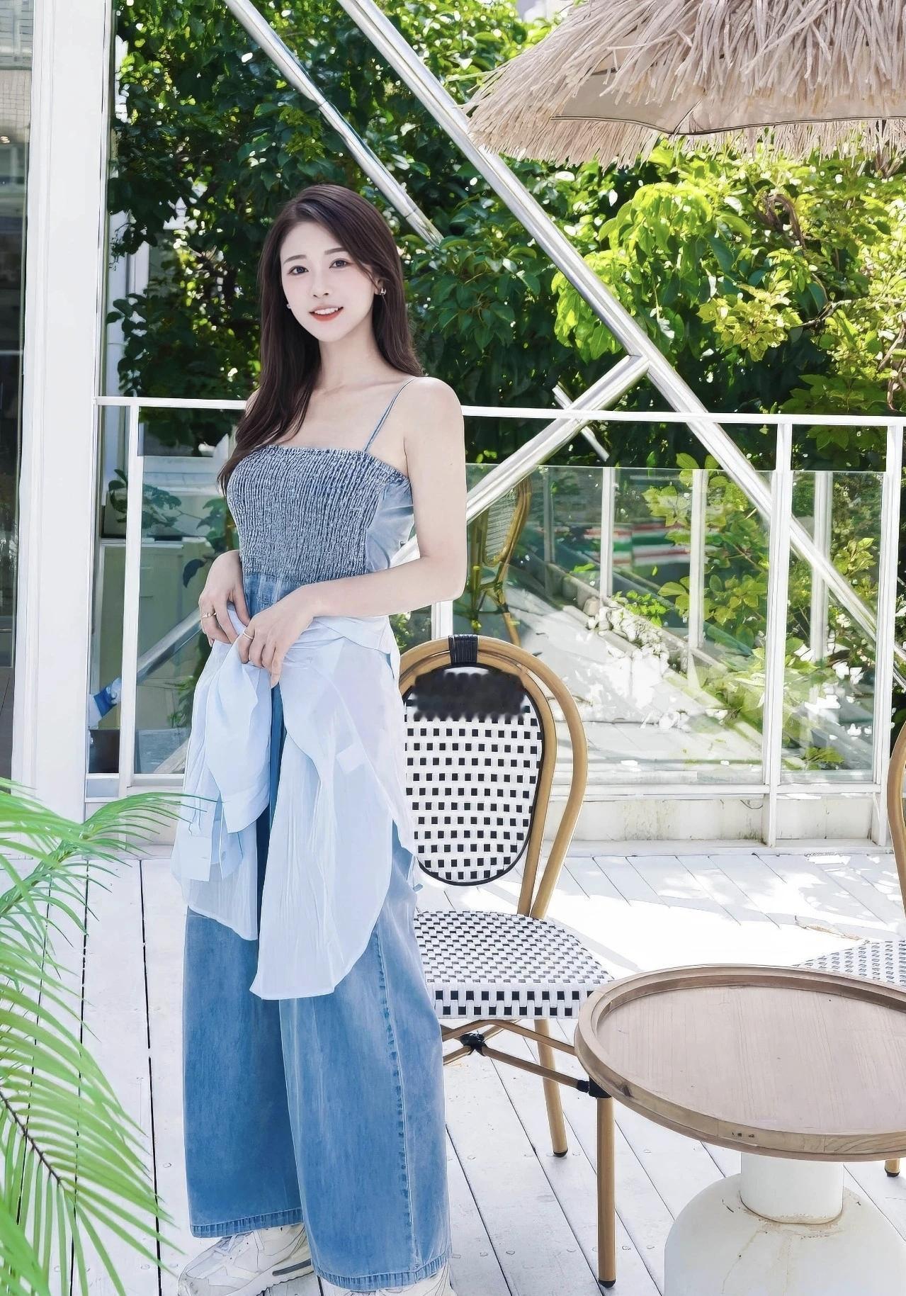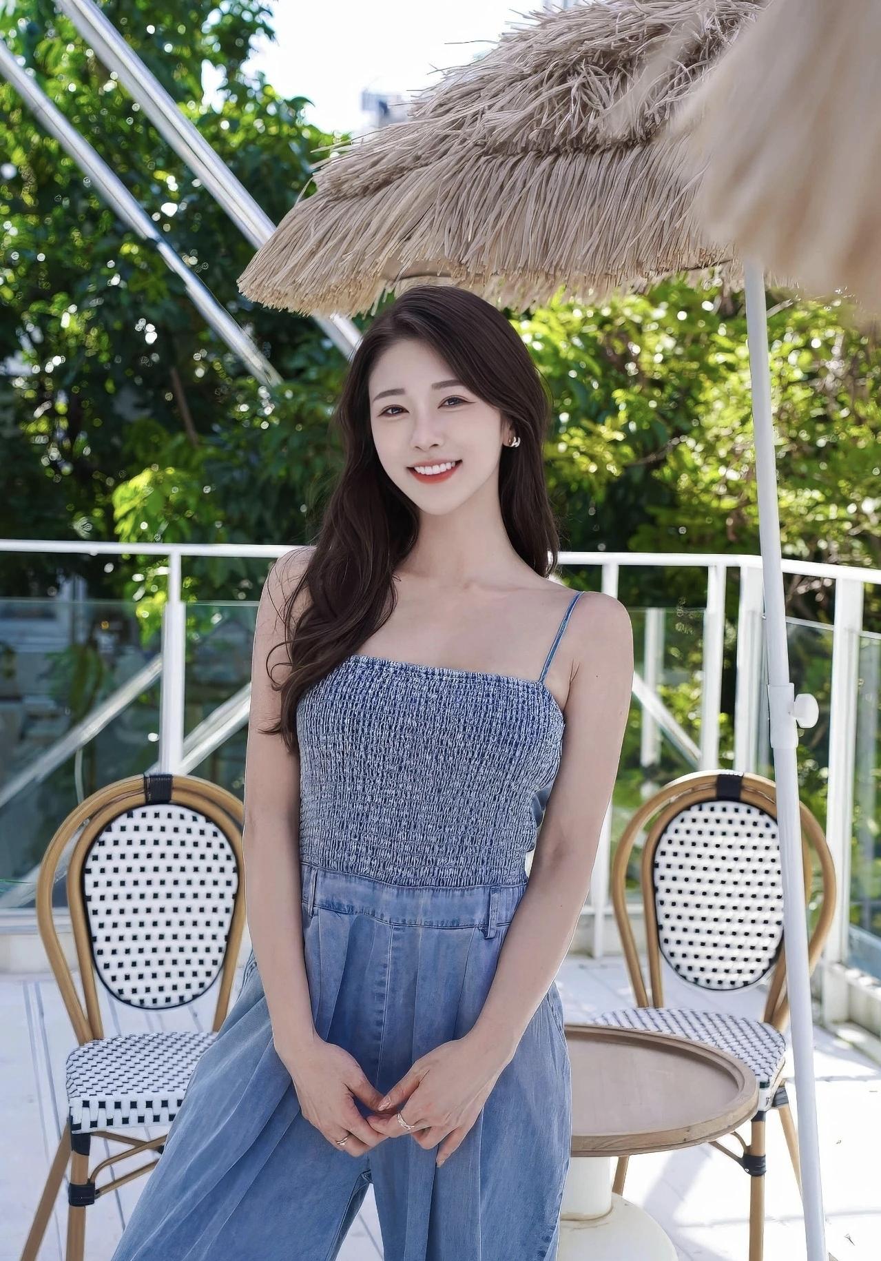 乡间小路被蓝天铺成温柔的画布,粉衫与灰牛仔揉出随性的甜,风掠过发梢时,草帽晃出细