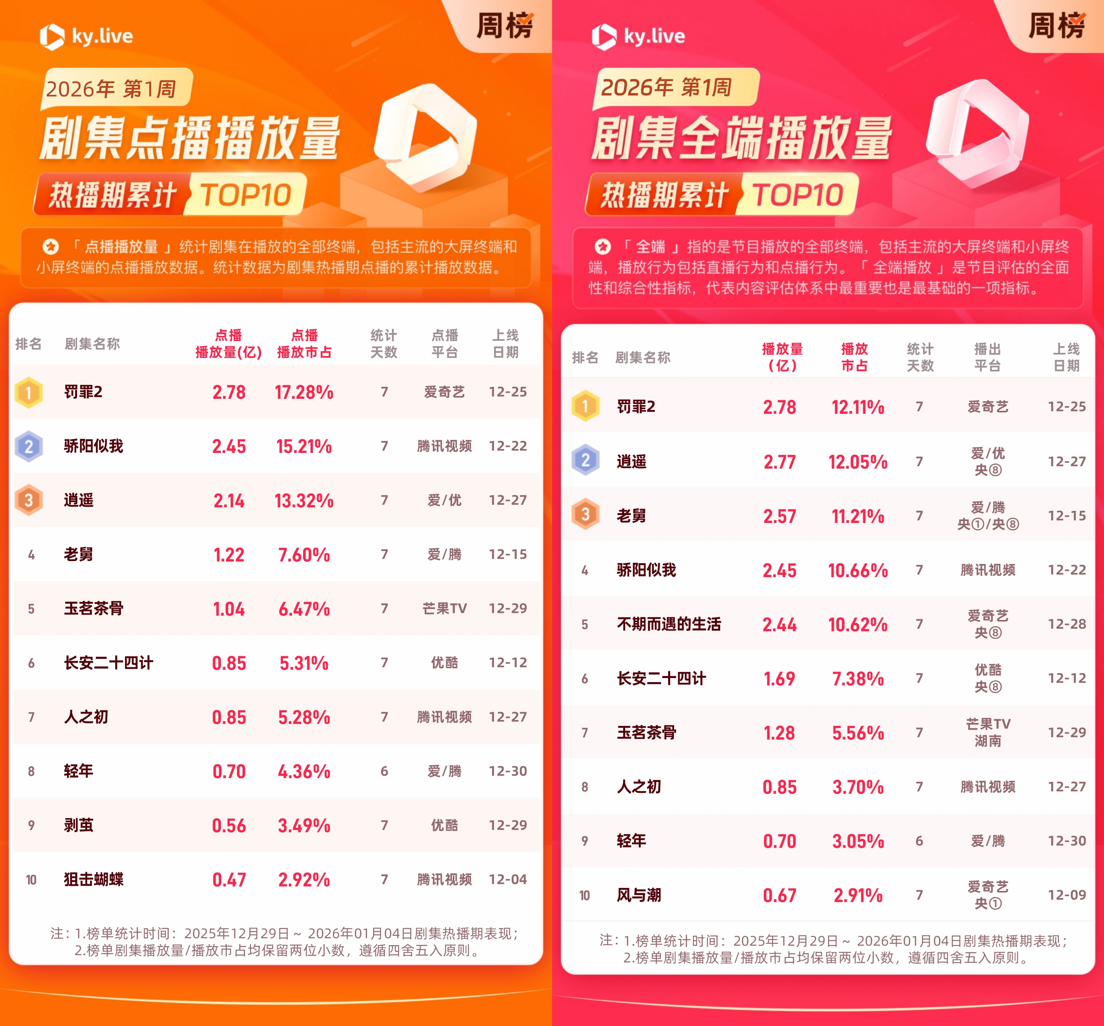 《罚罪2》开播第11天,继续在云合Top1领跑,Top1持续天数已经达到6天,同时《罚罪1》进入全网热播第十(含在播+所有老剧)!黄景瑜罚罪2 常征和秦枫都超棒!同时酷云日榜也是top1哈,酷云2026年第一周全端和点播周榜也是Top1
